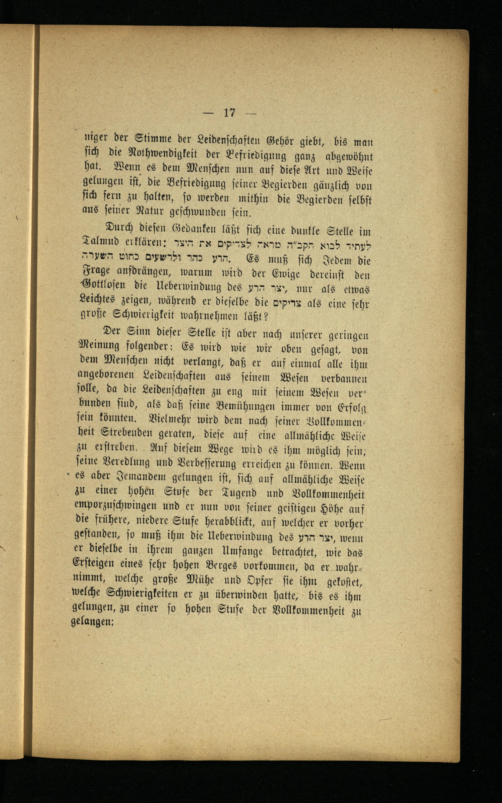 Der Sinn dieser Stelle ist aber nach unserer geringen Meinung folgender: Es wird wie wir oben gesagt, von dem Menschen nicht verlangt, daß er auf einmal alle ihm angeborenen Leidenschaften aus seinem Wesen verbannen solle, da die Leidenschaften zu eng mit seinem Wesen verbunden sind, als daß seine Bemühungen immer von Erfolg sein könnten. Vielmehr wird dem nach seiner Vollkommenheit Strebenden geraten, diese auf eine allmähliche Weise zu erstreben. Auf diesem Wege wird es ihm möglich sein, seine Veredlung und Verbesserung erreichen zu können. Wenn es aber Jemandem gelungen ist, sich auf allmähliche Weise zu einer hohen Stufe der Tugend und Vollkommenheit emporzuschwingen und er nun von seiner geistigen Höhe auf die frühere, niedere Stufe herabblickt, auf welcher er vorher gestanden, so muß ihm die Ueberwindung des y777, wenn er dieselbe in ihrem ganzen Umfange betrachtet, wie das Ersteigen eines sehr hohen Berges vorkommen, da er wahrnimmt, welche große Mühe und Opfer sie ihm gekostet, welche Schwierigkeiten er zu überwinden hatte, bis es ihm gelungen, zu einer so hohen Stufe der Vollkommenheit zu gelangen;