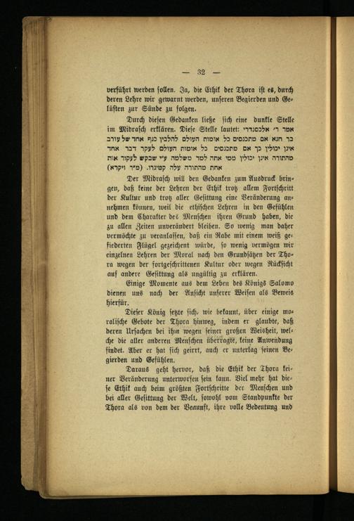 Daraus geht hervor, daß die Ethik der Thora keiner Veränderung unterworfen sein kann. Viel mehr hat diese Ethik auch beim größten Fortschritte der Menschen und bei aller Gesittung der Welt, sowohl vom Standpunkte der Thora als von dem der Venunft, ihre volle Bedeutung und
