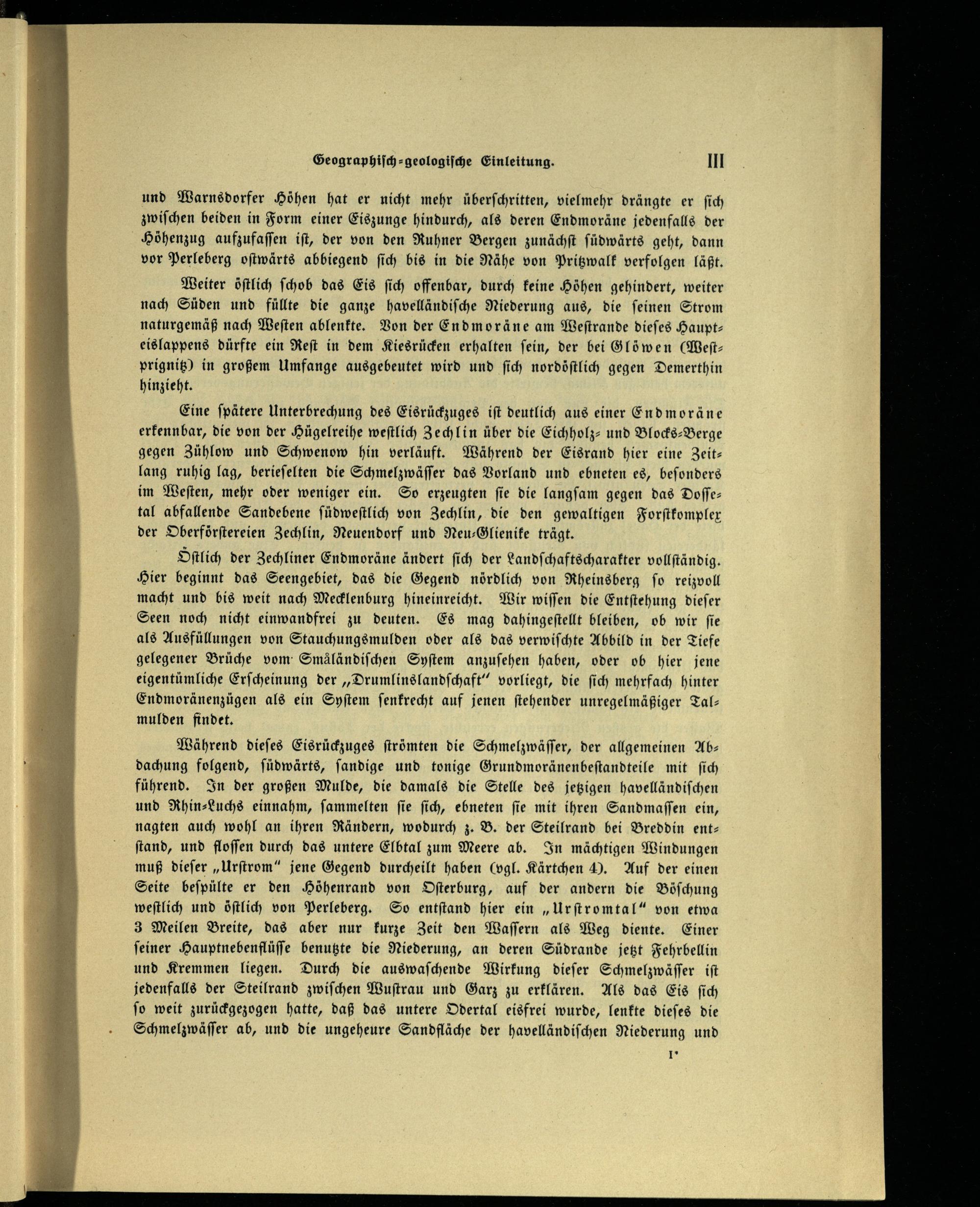 Weiter öſtlich ſchob das Eis ſich offenbar, durch keine Höhen gehindert, weiter nach Süden und füllte die ganze havelländiſche Niederung aus, die ſeinen Strom naturgemäß nach Weſten ablenkte. Von der Endmoräne am Weſtrande dieſes Haupt eislappens dürfte ein Reſt in dem Kiesrücken erhalten ſein, der bei Glöwen (Weſt prignitz) in großem Umfange ausgebeutet wird und ſich nordoöͤſtlich gegen Demerthin hinzieht.