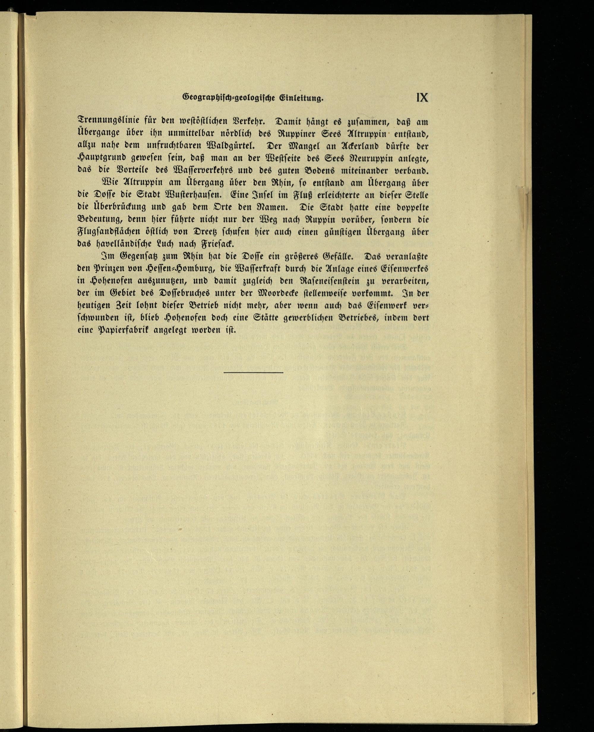 Wie Altruppin am Übergang über den Rhin, ſo entſtand am Übergang über die Doſſe die Stadt Wuſterhauſen . Eine Inſel im Fluß erleichterte an dieſer Stelle die Überbrückung und gab dem Orte den Namen. Die Stadt hatte eine doppelte Bedeutung, denn hier führte nicht nur der Weg nach Ruppin vorüber, ſondern die Flugſandflächen öſtlich von Dreetz ſchufen hier auch einen günſtigen Übergang über das havelländiſche Luch nach Frieſack .