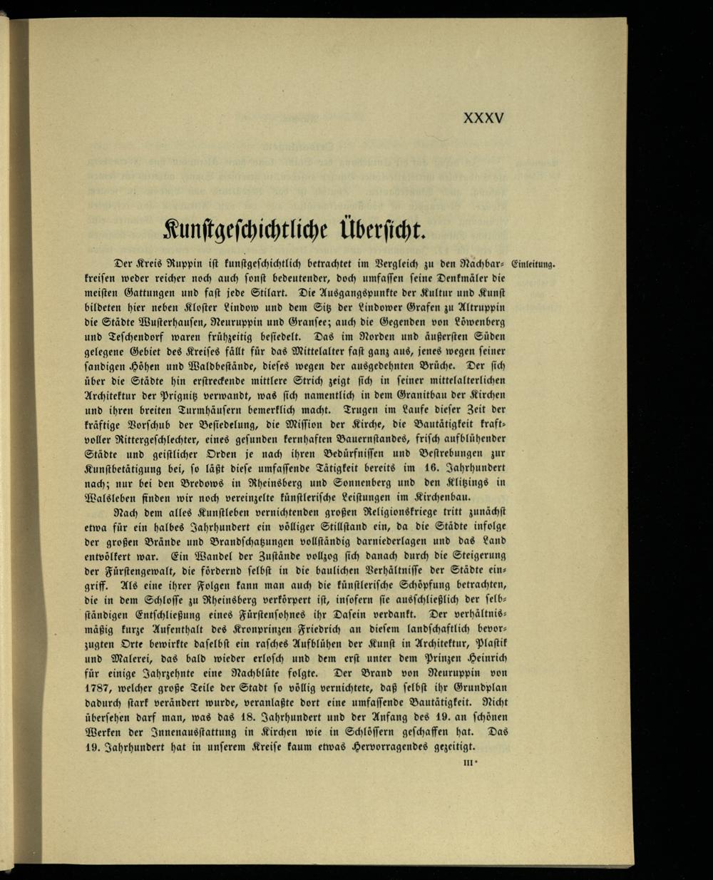 Der Kreis Ruppin iſt kunſtgeſchichtlich betrachtet im Vergleich zu den Nachbar⸗ Einleitung. kreiſen weder reicher noch auch ſonſt bedeutender, doch umfaſſen ſeine Denkmäler die meiſten Gattungen und faſt jede Stilart. Die Ausgangspunkte der Kultur und Kunſt bildeten hier neben Kloſter Lindow und dem Sitz der Lindower Grafen zu Altruppin