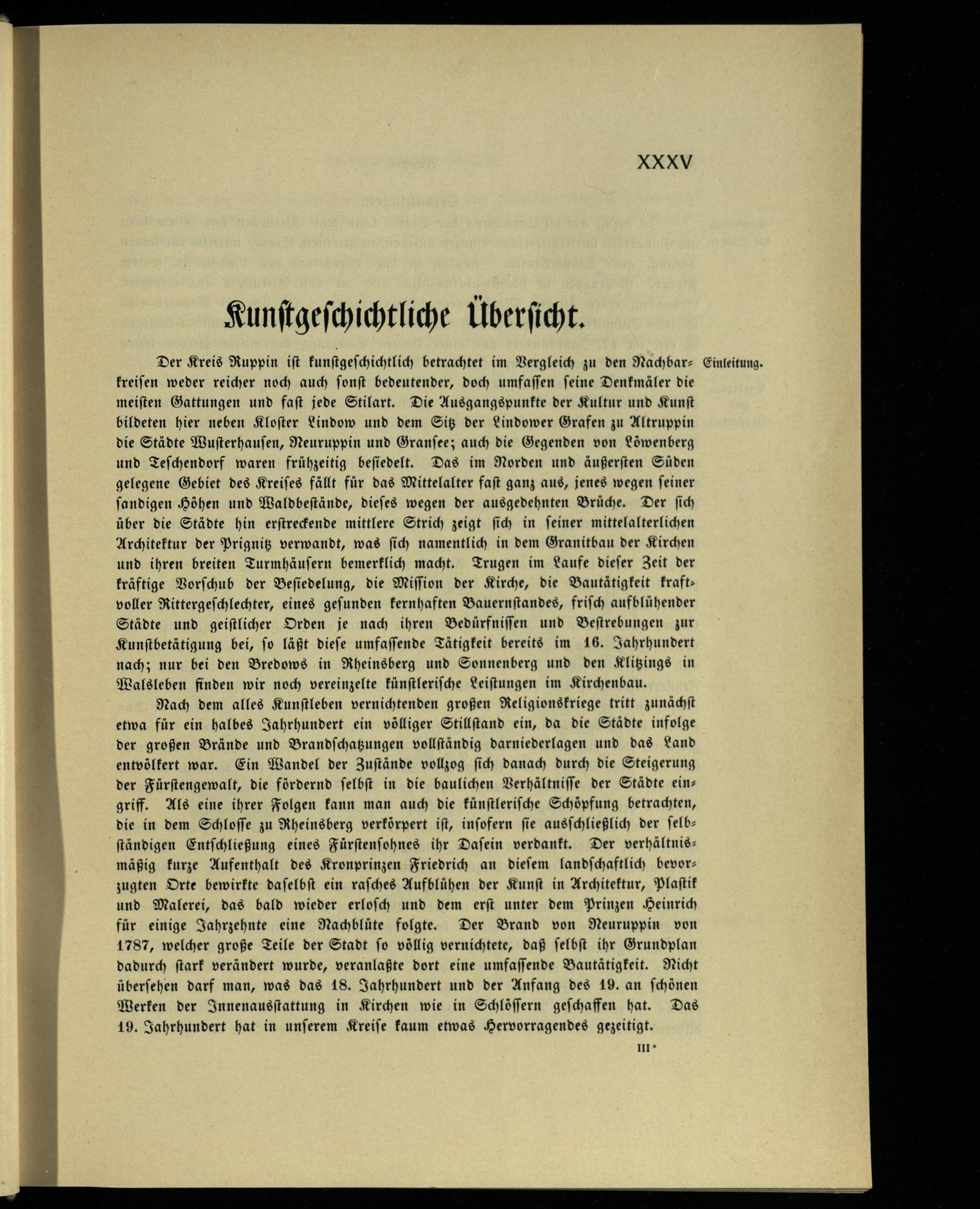 Nach dem alles Kunſtleben vernichtenden großen Religionskriege tritt zunächſt etwa für ein halbes Jahrhundert ein völliger Stillſtand ein, da die Städte infolge der großen Brände und Brandſchatzungen vollſtändig darniederlagen und das Land entvölkert war. Ein Wandel der Zuſtände vollzog ſich danach durch die Steigerung der Fürſtengewalt, die fördernd ſelbſt in die baulichen Verhältniſſe der Städte eingriff. Als eine ihrer Folgen kann man auch die künſtleriſche Schöpfung betrachten, die in dem Schloſſe zu Rheinsberg verkörpert iſt, inſofern fie ausſchließlich der felbſtändigen Entſchließung eines Fürſtenſohnes ihr Daſein verdankt. Der verhältnis: mäßig kurze Aufenthalt des Kronprinzen Friedrich an dieſem landſchaftlich bevor— zugten Orte bewirkte daſelbſt ein raſches Aufblühen der Kunſt in Architektur, Plaſtik und Malerei, das bald wieder erloſch und dem erſt unter dem Prinzen Heinrich für einige Jahrzehnte eine Nachblüte folgte. Der Brand von Neuruppin von 1787, welcher große Teile der Stadt ſo völlig vernichtete, daß ſelbſt ihr Grundplan dadurch ſtark verändert wurde, veranlaßte dort eine umfaſſende Bautätigkeit. Nicht überſehen darf man, was das 18. Jahrhundert und der Anfang des 19. an ſchönen Werken der Innenausſtattung in Kirchen wie in Schlöſſern geſchaffen hat. Das 19. Jahrhundert hat in unſerem Kreiſe kaum etwas Hervorragendes gezeitigt.