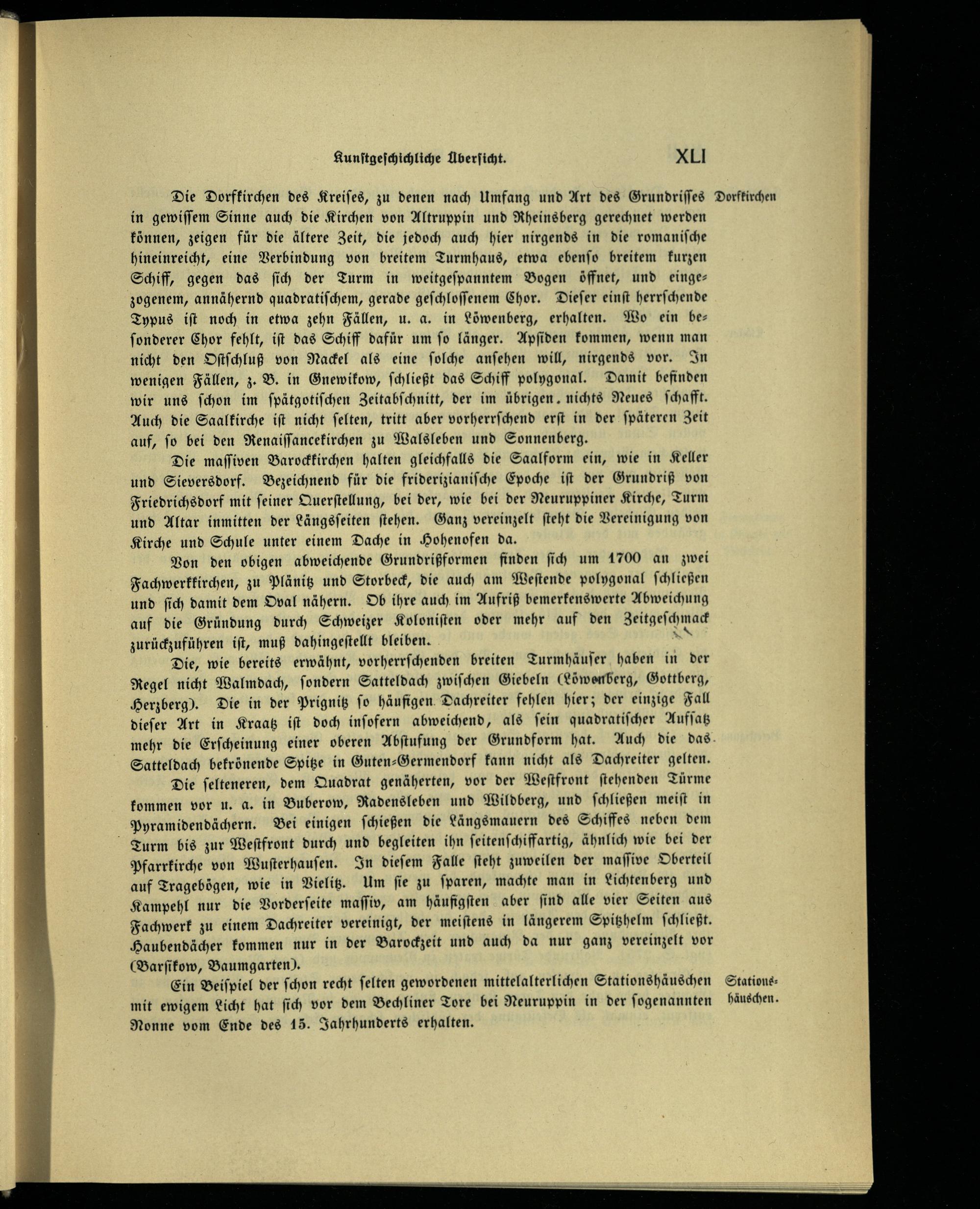 in gewiſſem Sinne auch die Kirchen von Altruppin und Rheinsberg gerechnet werden können, zeigen für die ältere Zeit, die jedoch auch hier nirgends in die romaniſche hineinreicht, eine Verbindung von breitem Turmhaus, etwa ebenſo breitem kurzen Schiff, gegen das ſich der Turm in weitgeſpanntem Bogen öffnet, und eingezogenem, annähernd quadratiſchem, gerade geſchloſſenem Chor. Dieſer einſt herrſchende Typus iſt noch in etwa zehn Fällen, u. a. in Löwenberg , erhalten. Wo ein beſonderer Chor fehlt, iſt das Schiff dafür um ſo länger. Apſiden kommen, wenn man nicht den Oſtſchluß von Nackel als eine ſolche anſehen will, nirgends vor. In wenigen Fällen, z. B. in Gnewikow , ſchließt das Schiff polygonal. Damit befinden wir uns ſchon im ſpätgotiſchen Zeitabſchnitt, der im übrigen nichts Neues ſchafft. Auch die Saalkirche iſt nicht ſelten, tritt aber vorherrſchend erſt in der ſpäteren Zeit auf, ſo bei den Renaiſſancekirchen zu Walsleben und Sonnenberg.