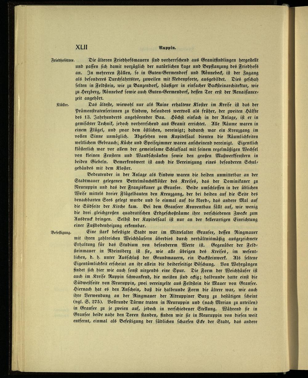 Eine ſtark befeſtigte Stadt war im Mittelalter Granſee , deſſen Ringmauer mit ihren zahlreichen Weichhäuſern überdies durch verhältnismäßig ausgezeichnete Erhaltung für das Studium von beſonderem Werte iſt. Gegenüber der Feldſteinnauer in Rheinsberg iſt fie, wie alle übrigen des Kreiſes, im weſent— lichen, d. h. unter Ausſchluß der Grundmauern, ein Backſteinwerk. Als ſeltene Eigentümlichkeit erſcheint an ihr allein die beiderſeitige Böſchung. Von Wehrgängen findet ſich hier wie auch ſonſt nirgends eine Spur. Die Form der Weichhäuſer iſt auch im Kreiſe Ruppin ſchwankend, die meiſten ſind eckig; halbrunde hatte einſt die Südweſtſeite von Neuruppin , zwei vereinzelte aus Feldſtein die Mauer von Granſee . Hiernach hat es den Anſchein, daß die halbrunde Form die ältere war, wie auch ihre Verwendung an der Ringmauer der Altruppiner Burg zu beſtätigen ſcheint (vgl. S. 275). Vollrunde Türme traten in Neuruppin und(nach Merian zu urteilen) in Granſee zu je zweien auf, jedoch in verſchiedener Stellung. Während ſie in Granſee beide nahe den Toren ſtanden, finden wir ſie in Neuruppin von dieſen weit entfernt, einmal als Befeſtigung der ſüdlichen ſcharfen Ecke der Stadt, das andere