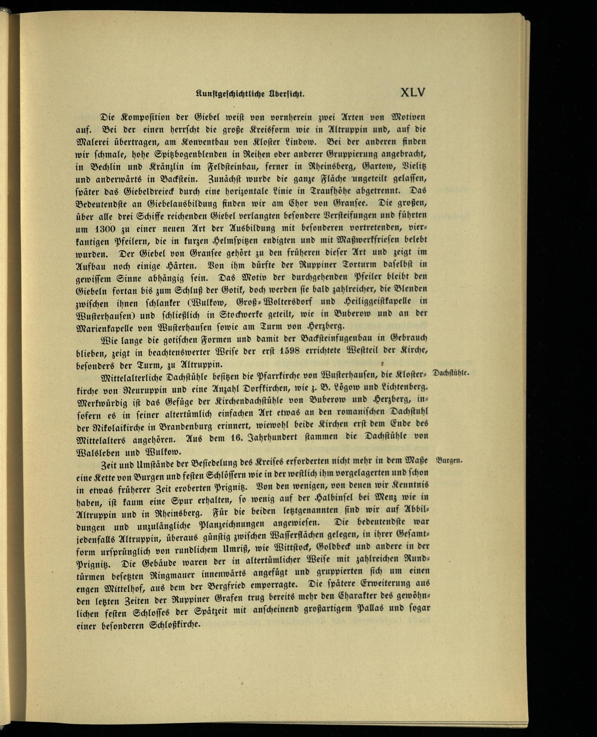Mittelalterliche Dachſtühle beſitzen die Pfarrkirche von Wuſterhauſen , die Kloſter­kirche von Neuruppin und eine Anzahl Dorfkirchen, wie z. B. Lögow und Lichtenberg. Merkwürdig iſt das Gefüge der Kirchendachſtühle von Buberow und Herzberg , in­ſofern es in ſeiner altertümlich einfachen Art etwas an den romaniſchen Dachſtuhl der Nikolaikirche in Brandenburg erinnert, wiewohl beide Kirchen erſt dem Ende des Mittelalters angehören. Aus dem 16. Jahrhundert ſtammen die Dachſtühle von Walsleben und Wulkow .