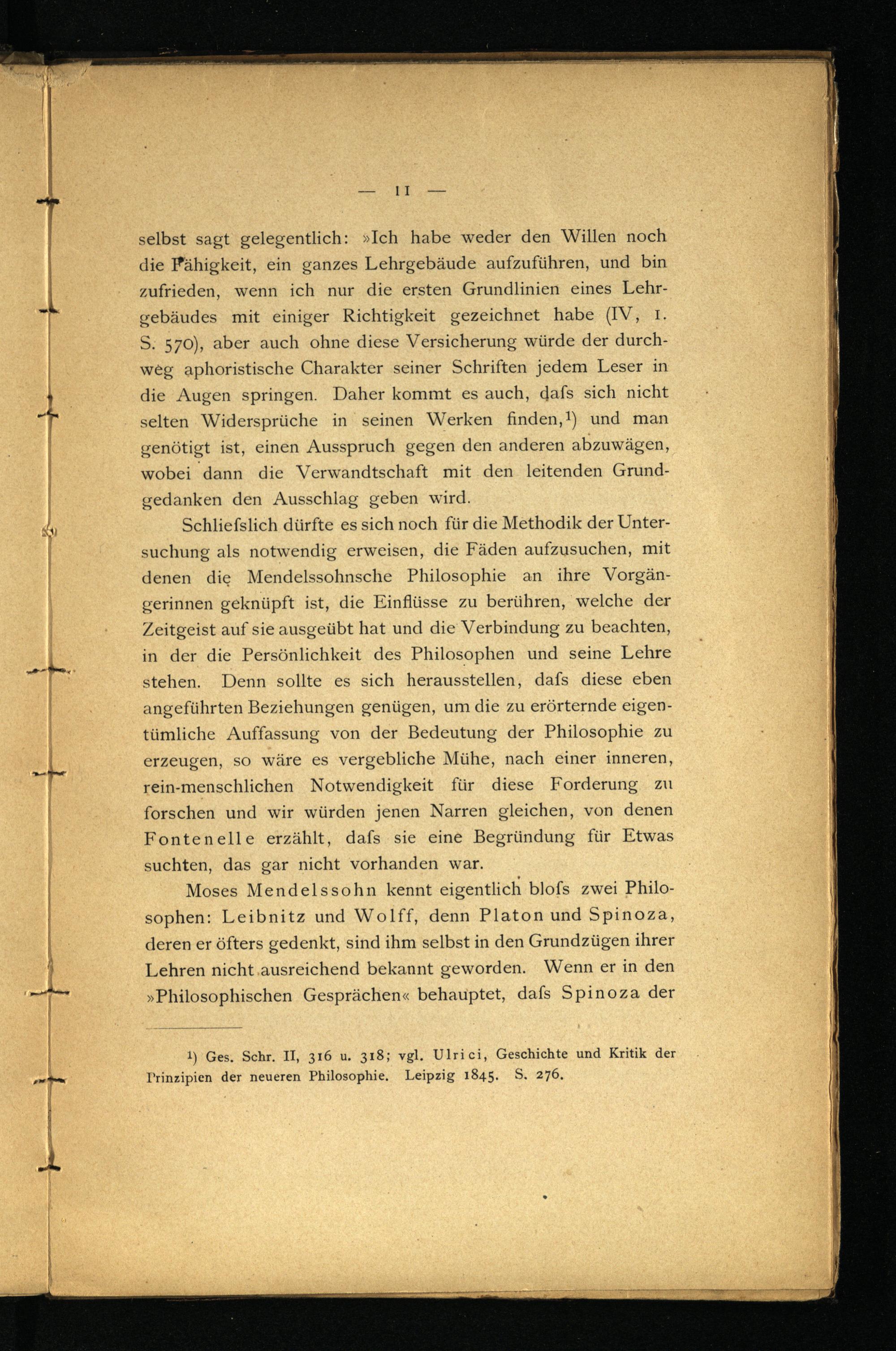 Moses Mendelssohn kennt eigentlich bloß zwei Philosophen: Leibnitz und Wolff, denn Platon und Spinoza, deren er öfters gedenkt, sind ihm selbst in den Grundzügen ihrer Lehren nicht ausreichend bekannt geworden. Wenn er in den »Philosophischen Gesprächen« behauptet, daß Spinoza der