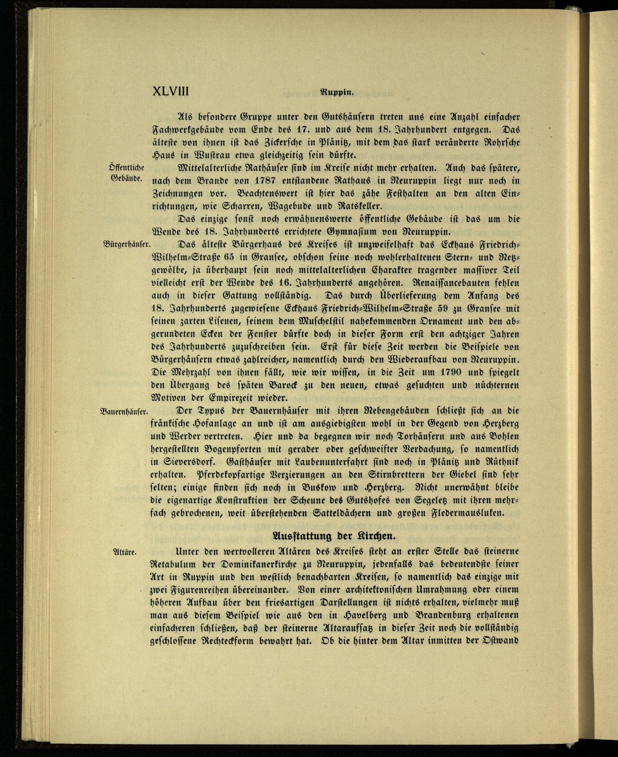 Mittelalterliche Rathäuſer ſind im Kreiſe nicht mehr erhalten. Auch das ſpätere, nach dem Brande von 1787 entſtandene Rathaus in Neuruppin liegt nur noch in Zeichnungen vor. Beachtenswert iſt hier das zähe Feſthalten an den alten Ein— richtungen, wie Scharren, Wagebude und Ratskeller.