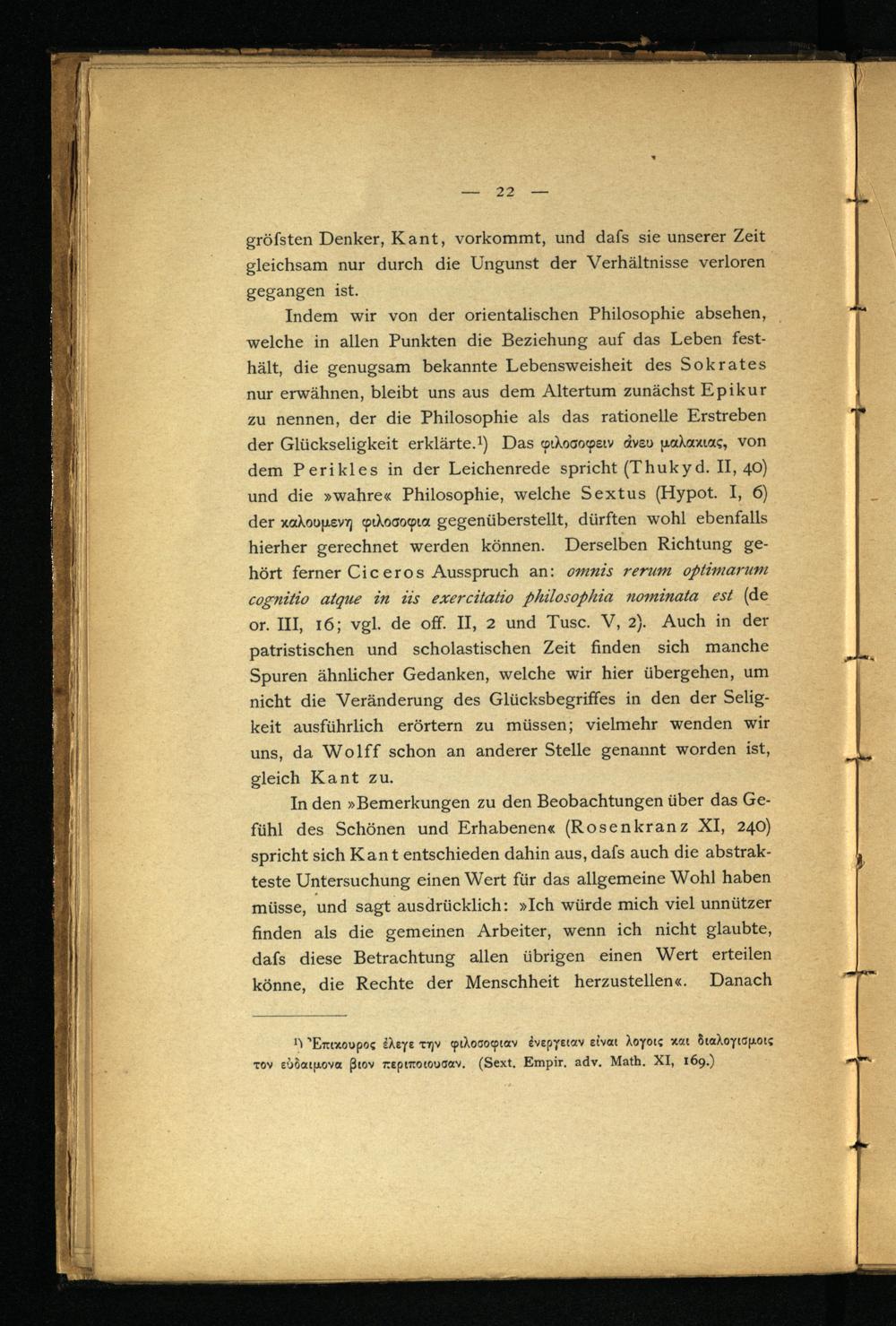 Indem wir von der orientalischen Philosophie absehen, welche in allen Punkten die Beziehung auf das Leben festhält, die genugsam bekannte Lebensweisheit des Sokrates nur erwähnen, bleibt uns aus dem Altertum zunächst Epikur zu nennen, der die Philosophie als das rationelle Erstreben der Glückseligkeit erklärte. 1 ) Das cptXocjocpeiv dveu paAaxias, von dem Perikies in der Leichenrede spricht (Thukyd. II, 40) und die »wahre« Philosophie, welche Sextus (Hypot. I, 6) der xaXoupevT) tptXoaotpta gegenüberstellt, dürften wohl ebenfalls hierher gerechnet werden können. Derselben Richtung gehört ferner Ciceros Ausspruch an: omnis rerum optiniarum cognitio atque in iis exercitatio philosophia nominata est (de or. III, 16; vgl. de off. II, 2 und Tusc. V, 2). Auch in der patristischen und scholastischen Zeit finden sich manche Spuren ähnlicher Gedanken, welche wir hier übergehen, um nicht die Veränderung des Glücksbegriffes in den der Seligkeit ausführlich erörtern zu müssen; vielmehr wenden wir uns, da Wolff schon an anderer Stelle genannt worden ist, gleich Kant zu.