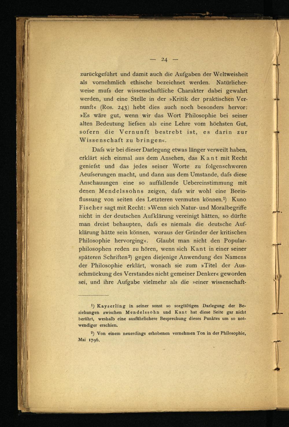 Daß wir bei dieser Darlegung etwas länger verweilt haben, erklärt sich einmal aus dem Ansehen, das Kant mit Recht genießt und das jedes seiner Worte zu folgenschweren Aeußerungen macht, und dann aus dem Umstande, daß diese Anschauungen eine so auffallende Uebereinstimmung mit denen Mendelssohns zeigen, daß wir wohl eine Beeinflussung von seiten des Letzteren vermuten können. 1 ) Kuno Fischer sagt mit Recht: »Wenn sich Natur- und Moralbegriffe nicht in der deutschen Aufklärung vereinigt hätten, so dürfte man dreist behaupten, dafs es niemals die deutsche Aufklärung hätte sein können, woraus der Gründer der kritischen Philosophie hervorging«. Glaubt man nicht den Popular- philosophen reden zu hören, wenn sich Kant in einer seiner späteren Schriften 2 ) gegen diejenige Anwendung des Namens der Philosophie erklärt, wonach sie zum »Titel der Ausschmückung des Verstandes nicht gemeiner Denker« geworden sei, und ihre Aufgabe vielmehr als die »einer wissenschaft-