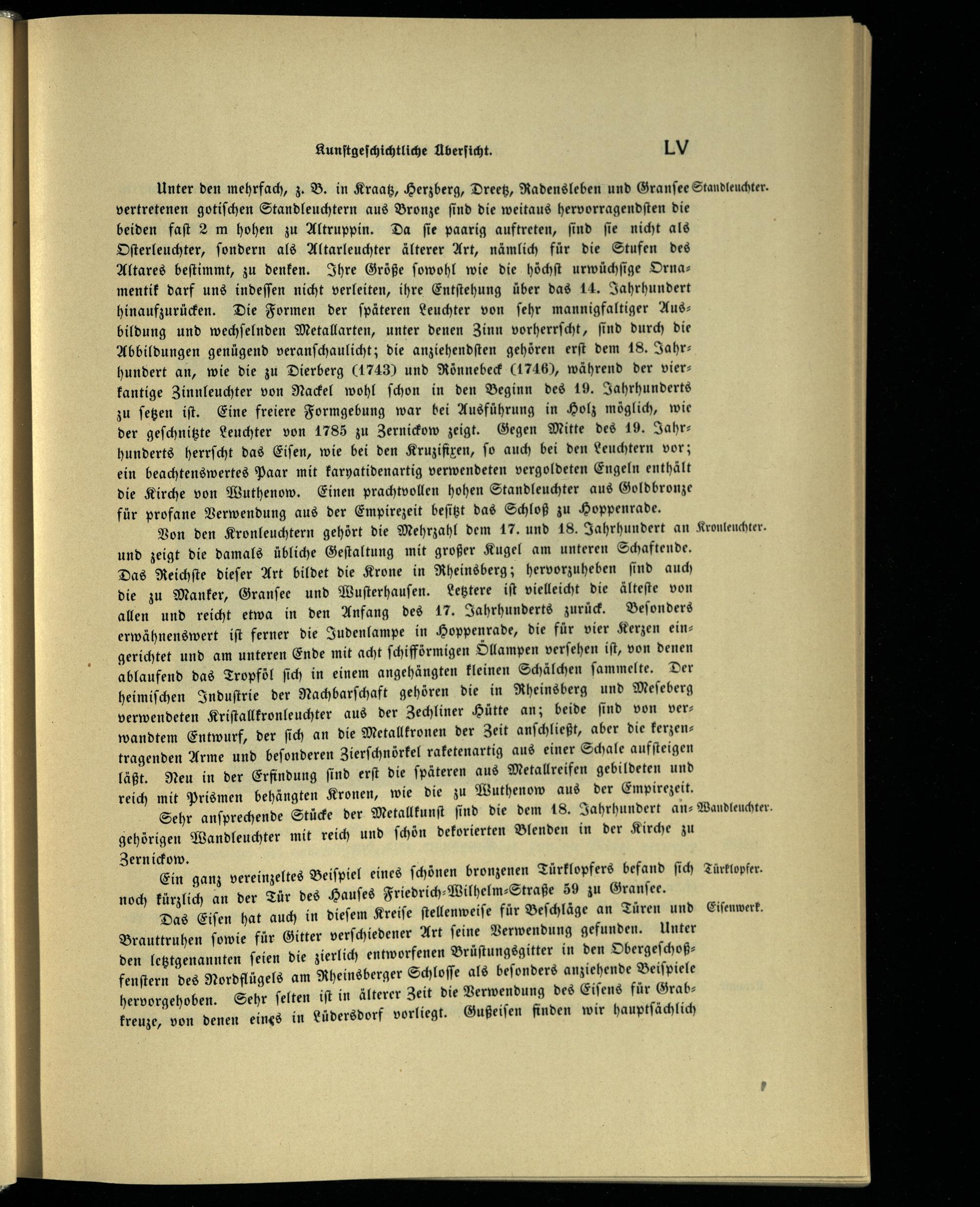 Von den Kronleuchtern gehört die Mehrzahl dem 17. und 18. Jahrhundert an Kronleuchter. und zeigt die damals übliche Geſtaltung mit großer Kugel am unteren Schaftende. Das Reichſte dieſer Art bildet die Krone in Rheinsberg ; hervorzuheben ſind auch die zu Manker, Granſee und Wuſterhauſen . Letztere iſt vielleicht die älteſte von allen und reicht etwa in den Anfang des 47. Jahrhunderts zurück. Beſonders erwähnenswert iſt ferner die Judenlampe in Hoppenrade , die für vier Kerzen eingerichtet und am unteren Ende mit acht ſchifförmigen Ollampen verſehen iſt, von denen ablaufend das Tropföl ſich in einem angehängten kleinen Schälchen ſammelte. Der heimiſchen Induſtrie der Nachbarſchaft gehören die in Rheinsberg und Meſeberg verwendeten Kriſtallkronleuchter aus der Zechliner Hütte an; beide ſind von verwandtem Entwurf, der ſich an die Metallkronen der Zeit anſchließt, aber die kerzentragenden Arme und beſonderen 3ierſchnörkel raketenartig aus einer Schale aufſteigen läßt. Neu in der Erfindung ſind erſt die ſpäteren aus Metallreifen gebildeten und reich mit Prismen behängten Kronen, wie die zu Wuthenow aus der Empirezeit.