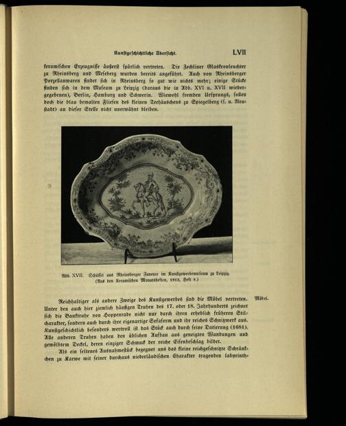 keramiſchen Erzeugniſſe äußerſt ſpärlich vertreten. Die Zechliner Glaskronleuchter zu Rheinsberg und Meſeberg wurden bereits angeführt. Auch von Rheinsberger Porzellanwaren findet ſich in Rheinsberg ſo gut wie nichts mehr; einige Stücke finden ſich in dem Muſeum zu Leipzig (daraus die in Abb. XVI u. XVII wiedergegebenen), Berlin , Hamburg und Schwerin . Wiewohl fremden Urſprungs, ſollen doch die blau bemalten Flieſen des kleinen Teehäuschens zu Spiegelberg (ſ. u. Neuſtadt) an dieſer Stelle nicht unerwähnt bleiben.