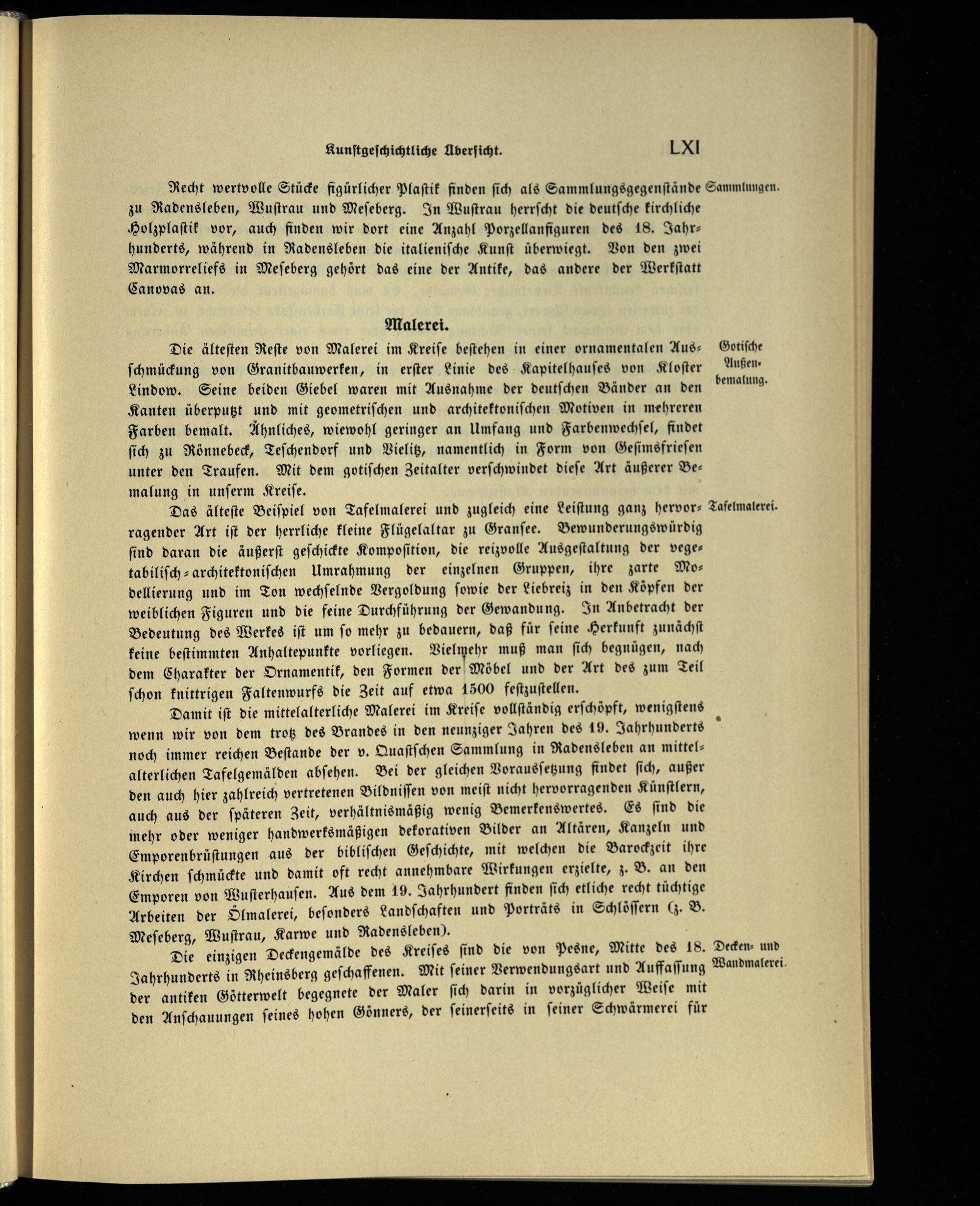 Damit iſt die mittelalterliche Malerei im Kreiſe vollſtändig erſchöpft, wenigſtens wenn wir von dem trotz des Brandes in den neunziger Jahren des 19. Jahrhunderts. noch immer reichen Beſtande der v. Quaſtſchen Sammlung in Radensleben an mittelalterlichen Tafelgemälden abſehen. Bei der gleichen Vorausſetzung findet ſich, außer den auch hier zahlreich vertretenen Bildniſſen von meiſt nicht hervorragenden Künſtlern, auch aus der ſpäteren Zeit, verhältnismäßig wenig Bemerkenswertes. Es ſind die mehr oder weniger handwerksmäßigen dekorativen Bilder an Altären, Kanzeln und Emporenbrüſtungen aus der bibliſchen Geſchichte, mit welchen die Barockzeit ihre Kirchen ſchmückte und damit oft recht annehmbare Wirkungen erzielte, z. B. an den Emporen von Wuſterhauſen . Aus dem 19. Jahrhundert finden ſich etliche recht tüchtige Arbeiten der Slmalerei, beſonders Landſchaften und Porträts in Schlöſſern(3. B. Meſeberg, Wuſtrau , Karwe und Radensleben).