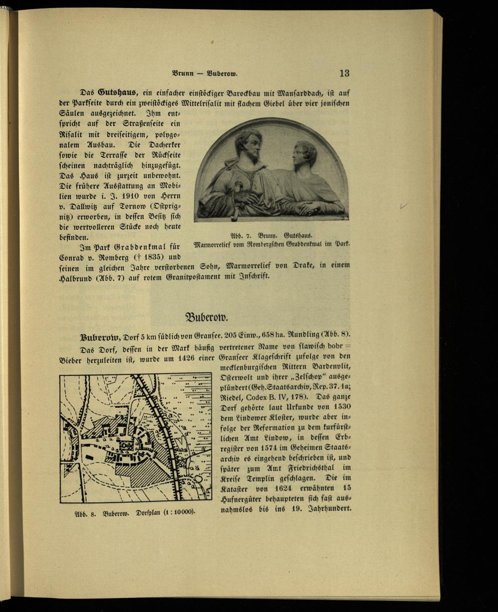 Buberow, Dorf 5 km ſüdlich von Granſee . 205 Einw., 658 ha. Rundling(Abb. 8). Das Dorf, deſſen in der Mark häufig vertretener Name von ſlawiſch bobr