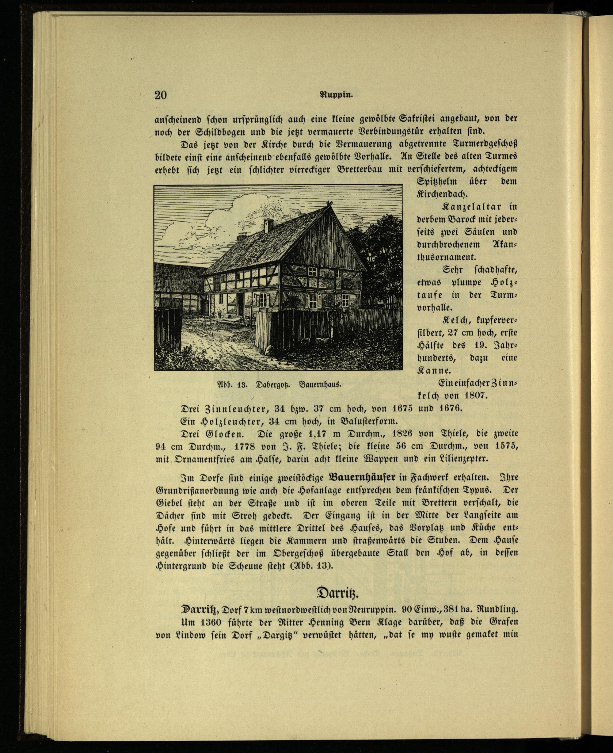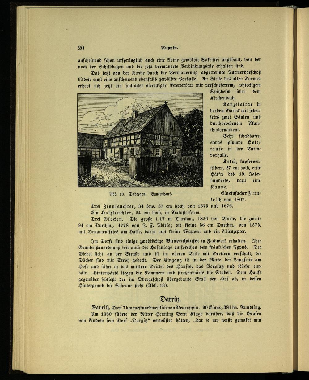 Abb. 13. Dabergotz. Bauernhaus. Ein einfacher Zinn ⸗ kelch von 1807. Drei Zinnleuchter, 34 bzw. 37 em hoch, von 1675 und 1676. Ein Holzleuchter, 34 em hoch, in Baluſterform. Drei Glocken. Die große 1,17 m Durchm., 1826 von Thiele, die zweite 94 em Durchm., 1778 von J. F. Thiele; die kleine 56 em Durchm., von 1575, mit Ornamentfries am Halſe, darin acht kleine Wappen und ein Lilienzepter.