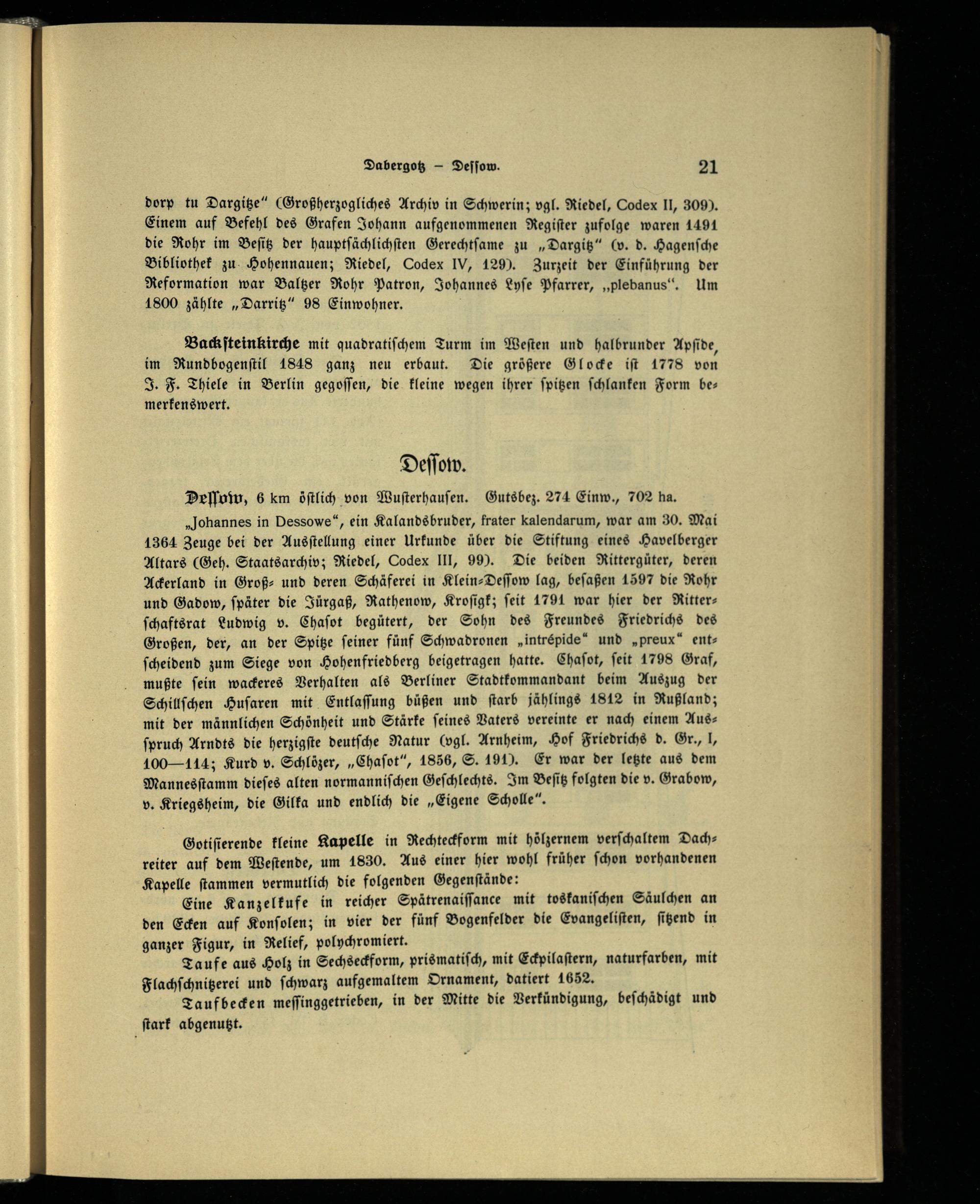 dorp tu Dargitze“(Großherzogliches Archiv in Schwerin ; vgl. Riedel, Codex Il, 309). Einem auf Befehl des Grafen Johann aufgenommenen Regiſter zufolge waren 1491 die Rohr im Beſitz der hauptſächlichſten Gerechtſame zu„Dargitz“(v. d. Hagenſche Bibliothek zu Hohennauen ; Riedel, Codex IV , 129). Zurzeit der Einführung der Reformation war Baltzer Rohr Patron, Johannes Lyſe Pfarrer,„plebanus‘“. Um 1800 zählte„Darritz“ gs Einwohner.