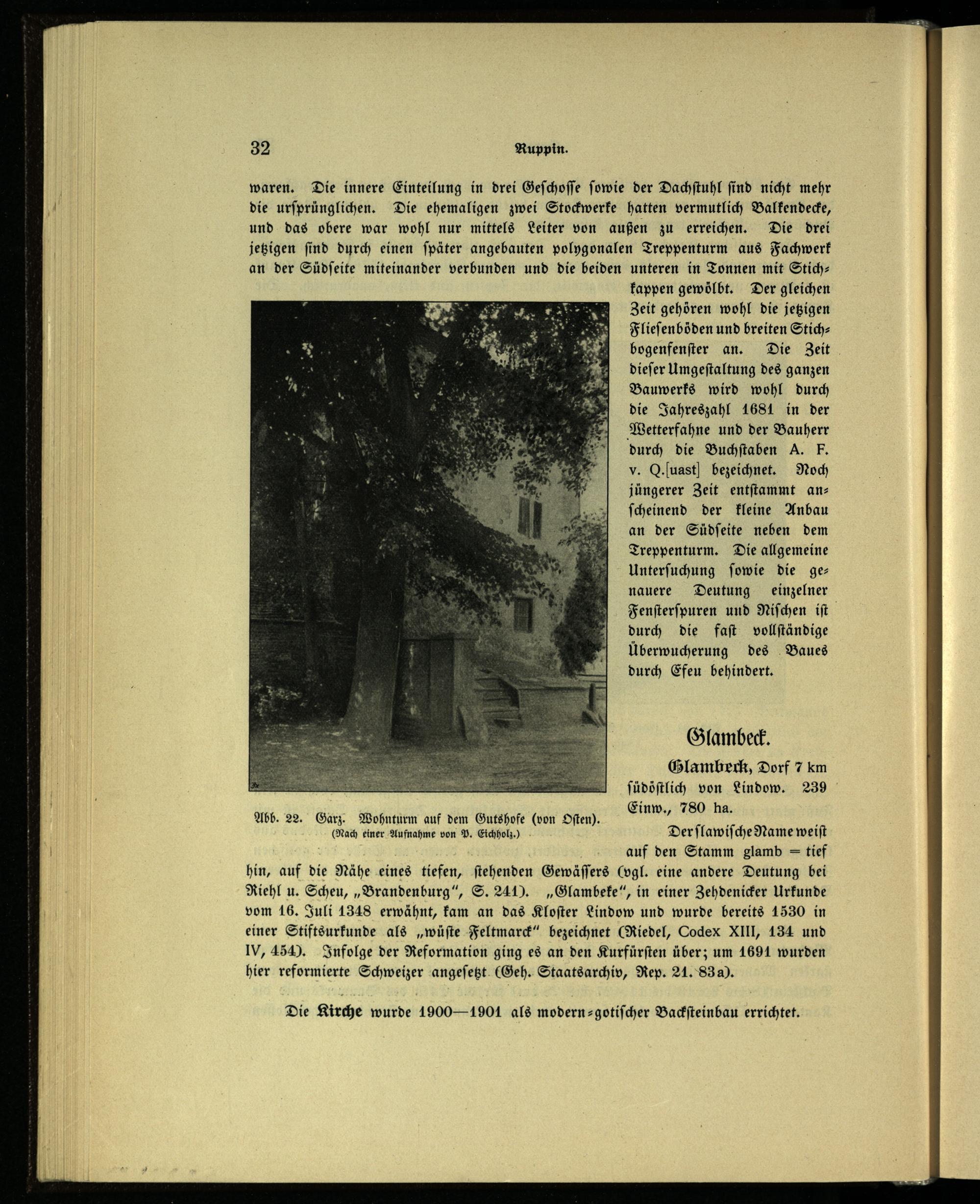 Einw., 780 ha. Abb. 22. Garz. Wohnturm auf dem Gutshofe(von Oſtem. ö; x (Nach einer Aufnahme von P. Eichholz.) Der ſlawiſche Name weiſt