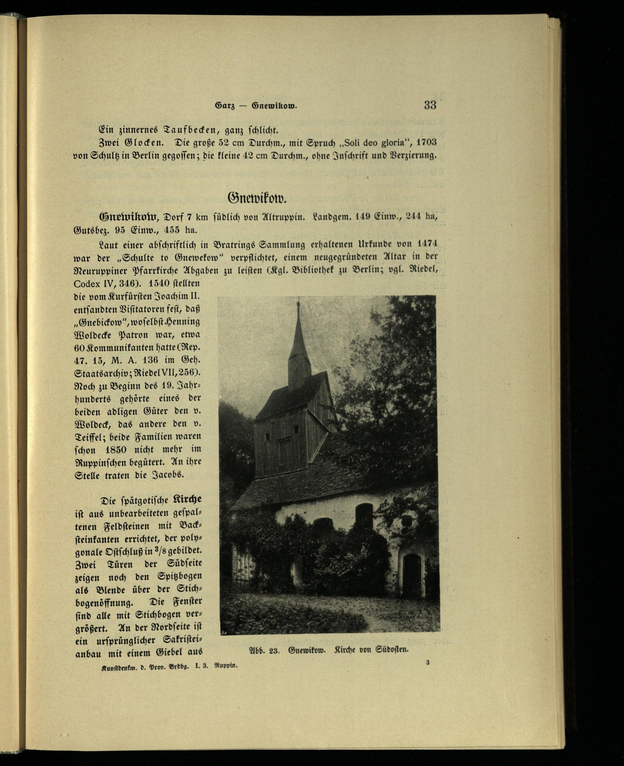 war der„Schulte to Gnewekow“ verpflichtet, einem neugegründeten Altar in der Neuruppiner Pfarrkirche Abgaben zu leiſten(Kgl. Bibliothek zu Berlin ; vgl. Riedel, Codex IV , 346). 1540 ſtellten die vom Kurfürſten Joachim ll. entſandten Viſitatoren feſt, daß „Gnebickow“, woſelbſt Henning Woldecke Patron war, etwa 60 Kommunikanten hatte(Rep. 47. 15, M. A. 136 im Geh. Staatsarchiv; Riedel VIl, 256). Noch zu Beginn des 19. Jahrhunderts gehörte eines der beiden adligen Güter den v. Woldeck, das andere den v. Teiffel; beide Familien waren ſchon 1850 nicht mehr im Ruppinſchen begütert. An ihre Stelle traten die Jacobs.