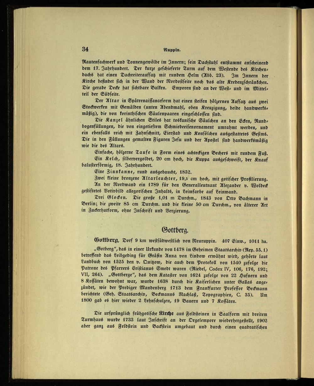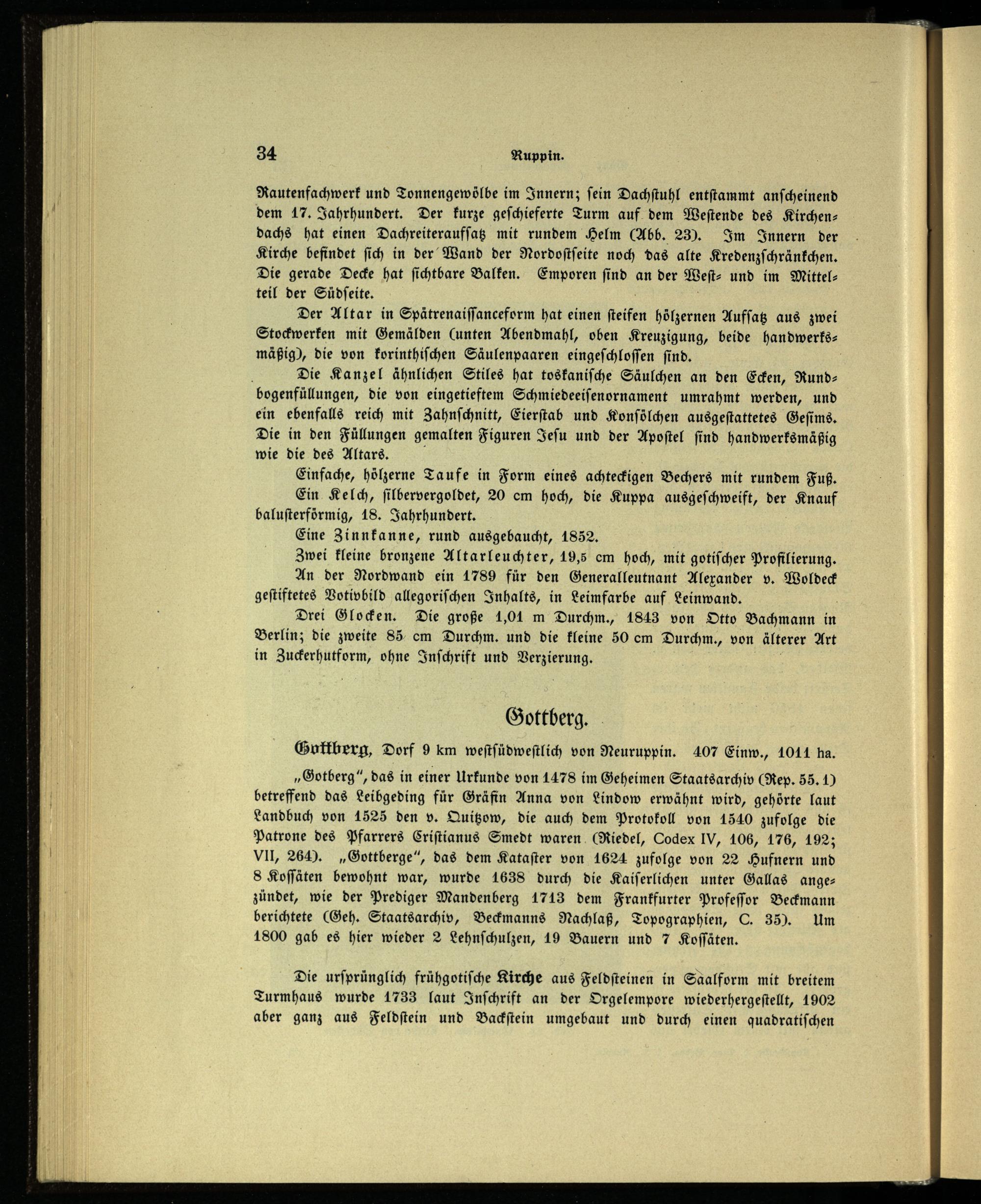 „Gotberg“, das in einer Urkunde von 1478 im Geheimen Staatsarchiv(Rep. 55.) betreffend das Leibgeding für Gräfin Anna von Lindow erwähnt wird, gehörte laut Landbuch von 1525 den v. Quitzow, die auch dem Protokoll von 1540 zufolge die Patrone des Pfarrers Criſtianus Smedt waren(Riedel, Codex IV , 106, 476, 192; Vll, 264).„Gottberge“, das dem Kataſter von 1624 zufolge von 22 Hufnern und 8 Koſſäten bewohnt war, wurde 1638 durch die Kaiſerlichen unter Gallas ange— zündet, wie der Prediger Mandenberg 1713 dem Frankfurter Profeſſor Beckmann berichtete(Geh. Staatsarchiv, Beckmanns Nachlaß, Topographien, C. 35). Um 1800 gab es hier wieder 2 Lehnſchulzen, 19 Bauern und 7 Koſſäten.