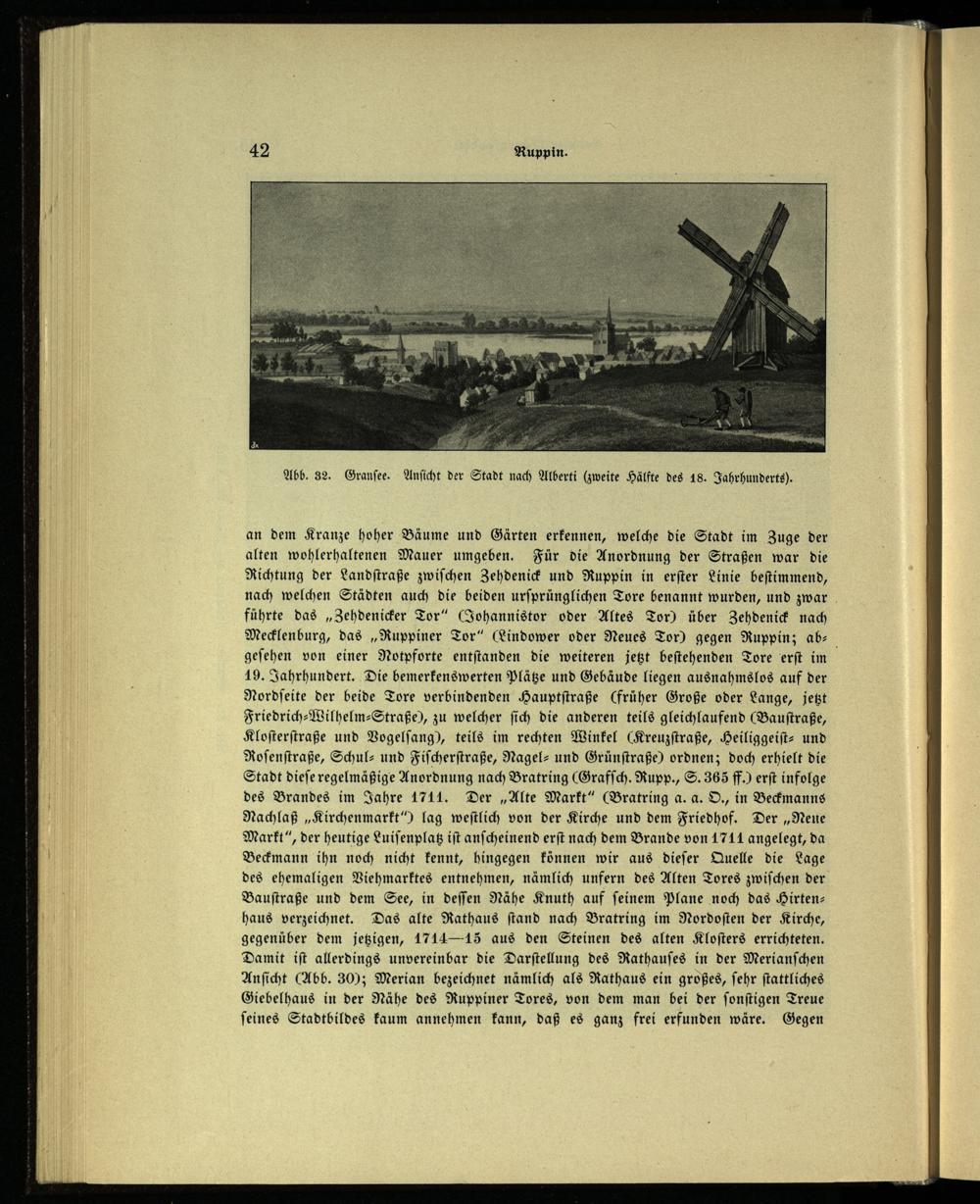 an dem Kranze hoher Bäume und Gärten erkennen, welche die Stadt im Zuge der alten wohlerhaltenen Mauer umgeben. Für die Anordnung der Straßen war die Richtung der Landſtraße zwiſchen Zehdenick und Ruppin in erſter Linie beſtimmend, nach welchen Städten auch die beiden urſprünglichen Tore benannt wurden, und zwar führte das„Zehdenicker Tor“(Johannistor oder Altes Tor) über Zehdenick nach Mecklenburg , das„Ruppiner Tor“(Lindower oder Neues Tor) gegen Ruppin; abgeſehen von einer Notpforte entſtanden die weiteren jetzt beſtehenden Tore erſt im 19. Jahrhundert. Die bemerkenswerten Plätze und Gebäude liegen ausnahmslos auf der Nordſeite der beide Tore verbindenden Hauptſtraße(früher Große oder Lange, jetzt Friedrich⸗Wilhelm⸗Straße), zu welcher ſich die anderen teils gleichlaufend(Bauſtraße, Kloſterſtraße und Vogelſang), teils im rechten Winkel(Kreuzſtraße, Heiliggeiſt- und Roſenſtraße, Schulz und Fiſcherſtraße, Nagel- und Grünſtraße) ordnen; doch erhielt die Stadt dieſe regelmäßige Anordnung nach Bratring(Grafſch. Rupp., S. 365 ff.) erſt infolge des Brandes im Jahre 1711. Der„Alte Markt“(Bratring a. a. O., in Beckmanns Nachlaß„Kirchenmarkt“ lag weſtlich von der Kirche und dem Friedhof. Der„Neue Markt“, der heutige Luiſenplatz iſt anſcheinend erſt nach dem Brande von 1714 angelegt, da Beckmann ihn noch nicht kennt, hingegen können wir aus dieſer Quelle die Lage des ehemaligen Viehmarktes entnehmen, nämlich unfern des Alten Tores zwiſchen der Bauſtraße und dem See, in deſſen Nähe Knuth auf feinem Plane noch das Hirtenhaus verzeichnet. Das alte Rathaus ſtand nach Bratring im Nordoſten der Kirche, gegenüber dem jetzigen, 1714— 15 aus den Steinen des alten Kloſters errichteten. Damit iſt allerdings unvereinbar die Darſtellung des Rathauſes in der Merianſchen Anſicht(Abb. 30); Merian bezeichnet nämlich als Rathaus ein großes, ſehr ſtattliches Giebelhaus in der Nähe des Ruppiner Tores, von dem man bei der ſonſtigen Treue ſeines Stadtbildes kaum annehmen kann, daß es ganz frei erfunden wäre. Gegen