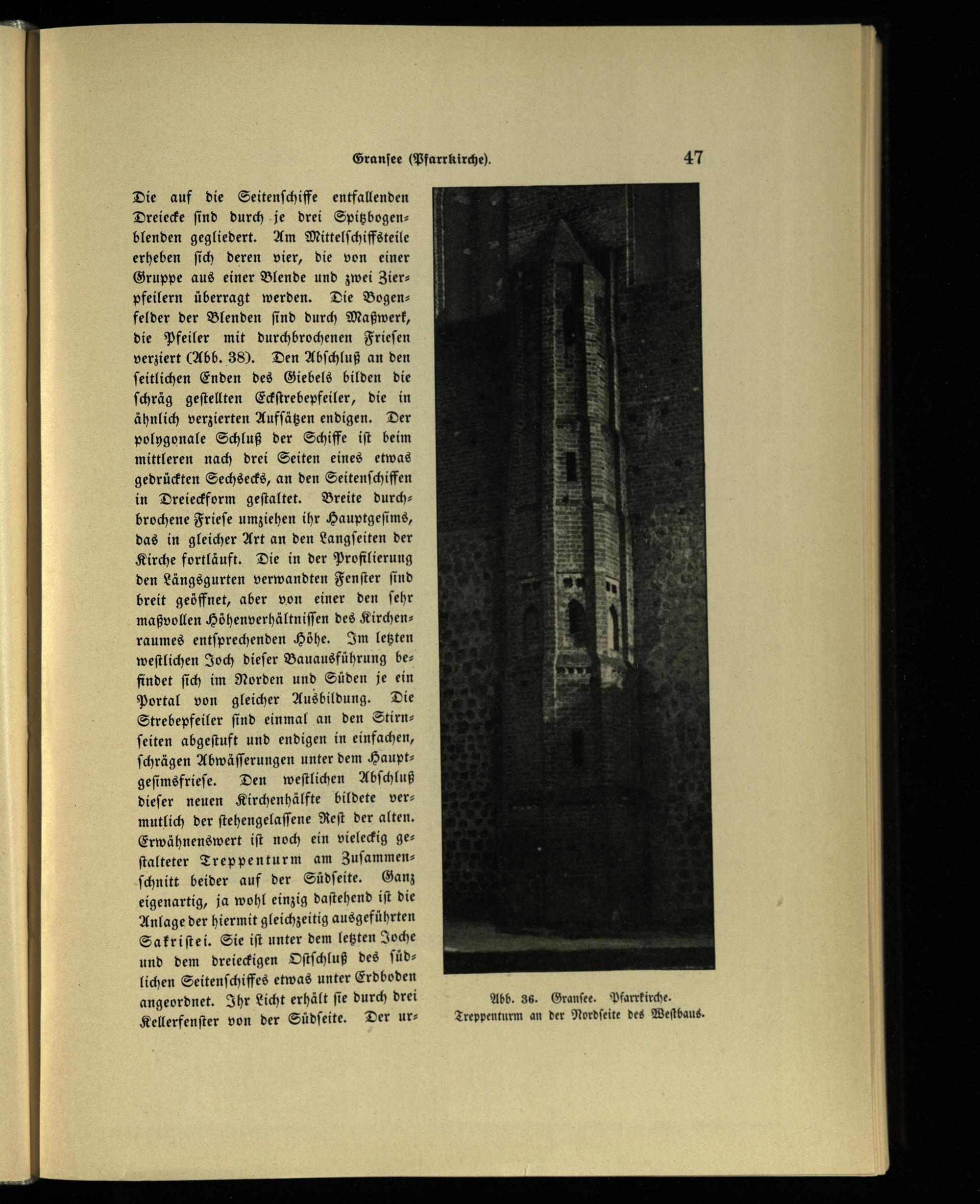 Die auf die Seitenſchiffe entfallenden Dreiecke ſind durch je drei Spitzbogenblenden gegliedert. Am Mittelſchiffsteile erheben ſich deren vier, die von einer Gruppe aus einer Blende und zwei Zierpfeilern überragt werden. Die Bogenfelder der Blenden ſind durch Maßwerk, die Pfeiler mit durchbrochenen Frieſen verziert(Abb. 38). Den Abſchluß an den ſeitlichen Enden des Giebels bilden die ſchräg geſtellten Eckſtrebepfeiler, die in ähnlich verzierten Aufſätzen endigen. Der polygonale Schluß der Schiffe iſt beim mittleren nach drei Seiten eines etwas gedrückten Sechsecks, an den Seitenſchiffen in Dreieckform geſtaltet. Breite durchbrochene Frieſe umziehen ihr Hauptgeſims, das in gleicher Art an den Langſeiten der Kirche fortläuft. Die in der Profilierung den Längsgurten verwandten Fenſter ſind breit geöffnet, aber von einer den ſehr maßvollen Höhenverhältniſſen des Kirchenraumes entſprechenden Höhe. Im letzten weſtlichen Joch dieſer Bauausführung befindet ſich im Norden und Süden je ein Portal von gleicher Ausbildung. Die Strebepfeiler ſind einmal an den Stirnſeiten abgeſtuft und endigen in einfachen, ſchrägen Abwäſſerungen unter dem Hauptgeſimsfrieſe. Den weſtlichen Abſchluß dieſer neuen Kirchenhälfte bildete vermutlich der ſtehengelaſſene Reſt der alten. Erwähnenswert iſt noch ein vieleckig geſtalteter Treppenturm am Zuſammenſchnitt beider auf der Südſeite. Ganz eigenartig, ja wohl einzig daſtehend iſt die Anlage der hiermit gleichzeitig ausgeführten Sakriſte i. Sie iſt unter dem letzten Joche und dem dreieckigen Oſtſchluß des ſůüdlichen Seitenſchiffes etwas unter Erdboden angeordnet. Ihr Licht erhält ſie durch drei Kellerfenſter von der Südſeite. Der ur