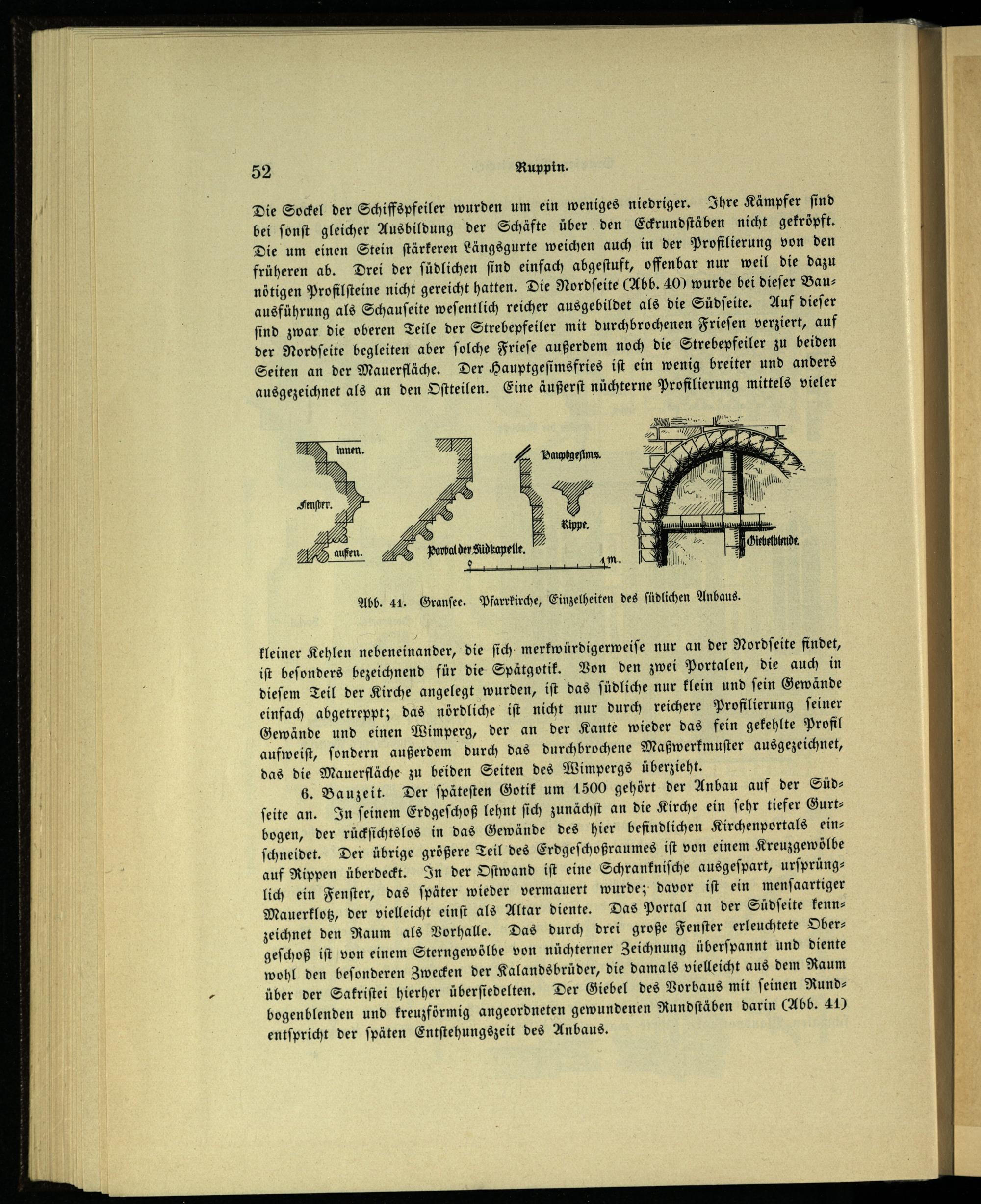6. Bauzeit. Der ſpäteſten Gotik um 1500 gehört der Anbau auf der Süd— ſeite an. In ſeinem Erdgeſchoß lehnt ſich zunächſt an die Kirche ein ſehr tiefer Gurtbogen, der rückſichtslos in das Gewände des hier befindlichen Kirchenportals einſchneidet. Der übrige größere Teil des Erdgeſchoßraumes iſt von einem Kreuzgewölbe auf Rippen überdeckt. In der Oſtwand iſt eine Schrankniſche ausgeſpart, urſprünglich ein Fenſter, das ſpäter wieder vermauert wurde; davor iſt ein menſaartiger Mauerklotz, der vielleicht einſt als Altar diente. Das Portal an der Südſeite kennzeichnet den Raum als Vorhalle. Das durch drei große Fenſter erleuchtete Obergeſchoß iſt von einem Sterngewölbe von nüchterner Zeichnung überſpannt und diente wohl den beſonderen Zwecken der Kalandsbrüder, die damals vielleicht aus dem Raum über der Sakriſtei hierher überſiedelten. Der Giebel des Vorbaus mit ſeinen Rundbogenblenden und kreuzförmig angeordneten gewundenen Rundſtäben darin(Abb. 41) entſpricht der ſpäten Entſtehungszeit des Anbaus.