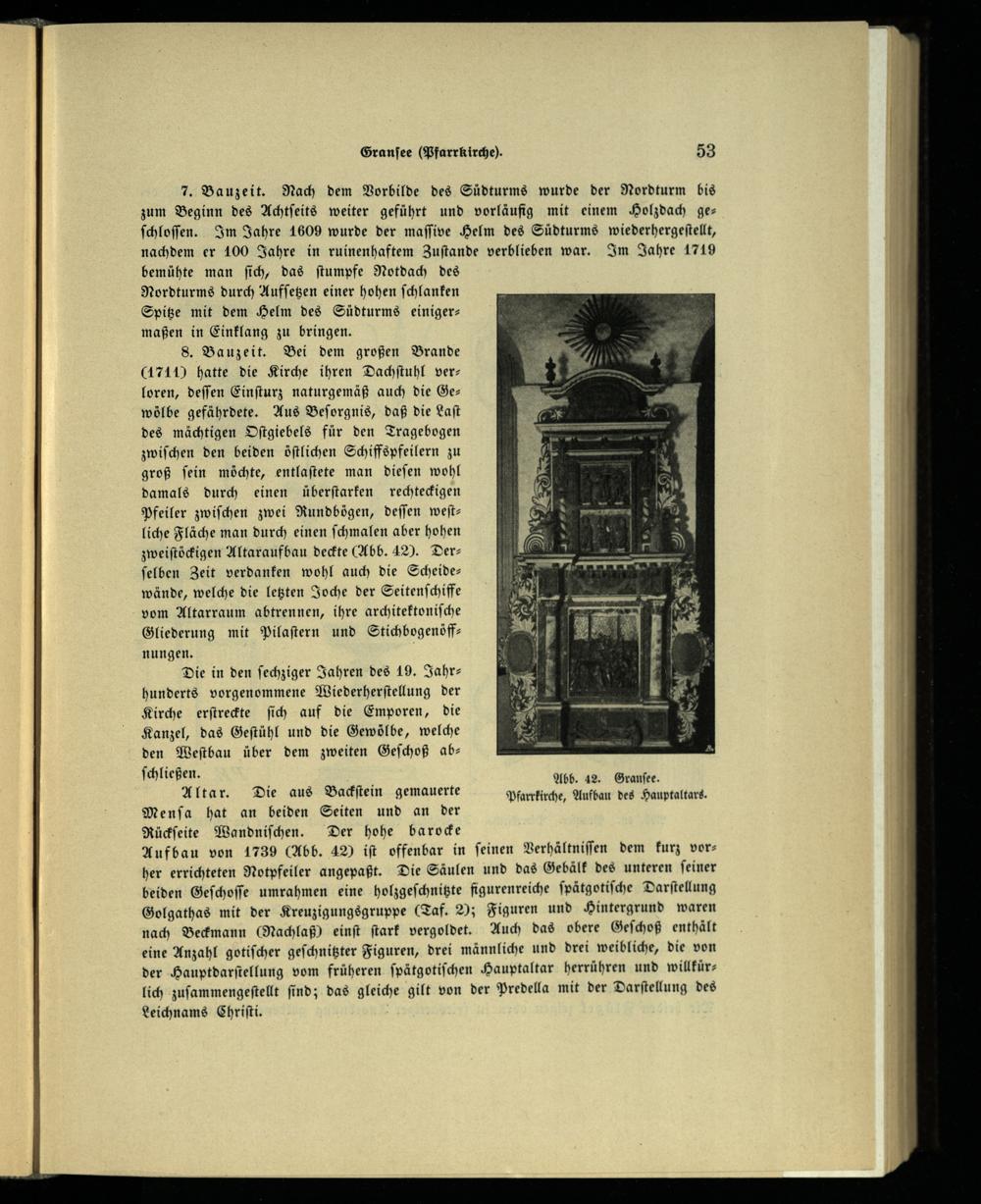 ſchloſſen. Im Jahre 1609 wurde der maſſive Helm des Südturms wiederhergeſtellt, nachdem er 100 Jahre in ruinenhaftem Zuſtande verblieben war. Im Jahre 1719 bemühte man ſich, das ſtumpfe Notdach des Nordturms durch Aufſetzen einer hohen ſchlanken Spitze mit dem Helm des Südturms einigermaßen in Einklang zu bringen. 8. Bauzeit. Bei dem großen Brande (1711) hatte die Kirche ihren Dachſtuhl verloren, deſſen Einſturz naturgemäß auch die Gewölbe gefährdete. Aus Beſorgnis, daß die Laſt des mächtigen Oſtgiebels für den Tragebogen zwiſchen den beiden öſtlichen Schiffspfeilern zu groß ſein möchte, entlaſtete man dieſen wohl damals durch einen überſtarken rechteckigen Pfeiler zwiſchen zwei Rundbögen, deſſen weſt— liche Fläche man durch einen ſchmalen aber hohen zweiſtöckigen Altaraufbau deckte(Abb. 42). Derſelben Zeit verdanken wohl auch die Scheide wände, welche die letzten Joche der Seitenſchiffe vom Altarraum abtrennen, ihre architektoniſche Gliederung mit Pilaſtern und Stichbogenöff— nungen. Die in den ſechziger Jahren des 19. Jahrhunderts vorgenommene Wiederherſtellung der Kirche erſtreckte ſich auf die Emporen, die Kanzel, das Geſtühl und die Gewölbe, welche den Weſtbau über dem zweiten Geſchoß ab— ſchlie ßen. ⸗. Abb. 42. Granſee. Altar. Die aus Backſtein gemauerte Pfarrkirche, Aufbau des Hauptaltars. Menſa hat an beiden Seiten und an der Rückſeite Wandniſchen. Der hohe barocke Aufbau von 1739(Abb. 42) iſt offenbar in ſeinen Verhältniſſen dem kurz vorher errichteten Notpfeiler angepaßt. Die Säulen und das Gebälk des unteren ſeiner beiden Geſchoſſe umrahmen eine holzgeſchnitzte figurenreiche ſpätgotiſche Darſtellung Golgathas mit der Kreuzigungsgruppe(Taf. 2); Figuren und Hintergrund waren nach Beckmann(Nachlaß) einſt ſtark vergoldet. Auch das obere Geſchoß enthält eine Anzahl gotiſcher geſchnitzter Figuren, drei männliche und drei weibliche, die von der Hauptdarſtellung vom früheren ſpätgotiſchen Hauptaltar herrühren und willkürlich zuſammengeſtellt ſind; das gleiche gilt von der Predella mit der Darſtellung des Leichnams Chriſti.