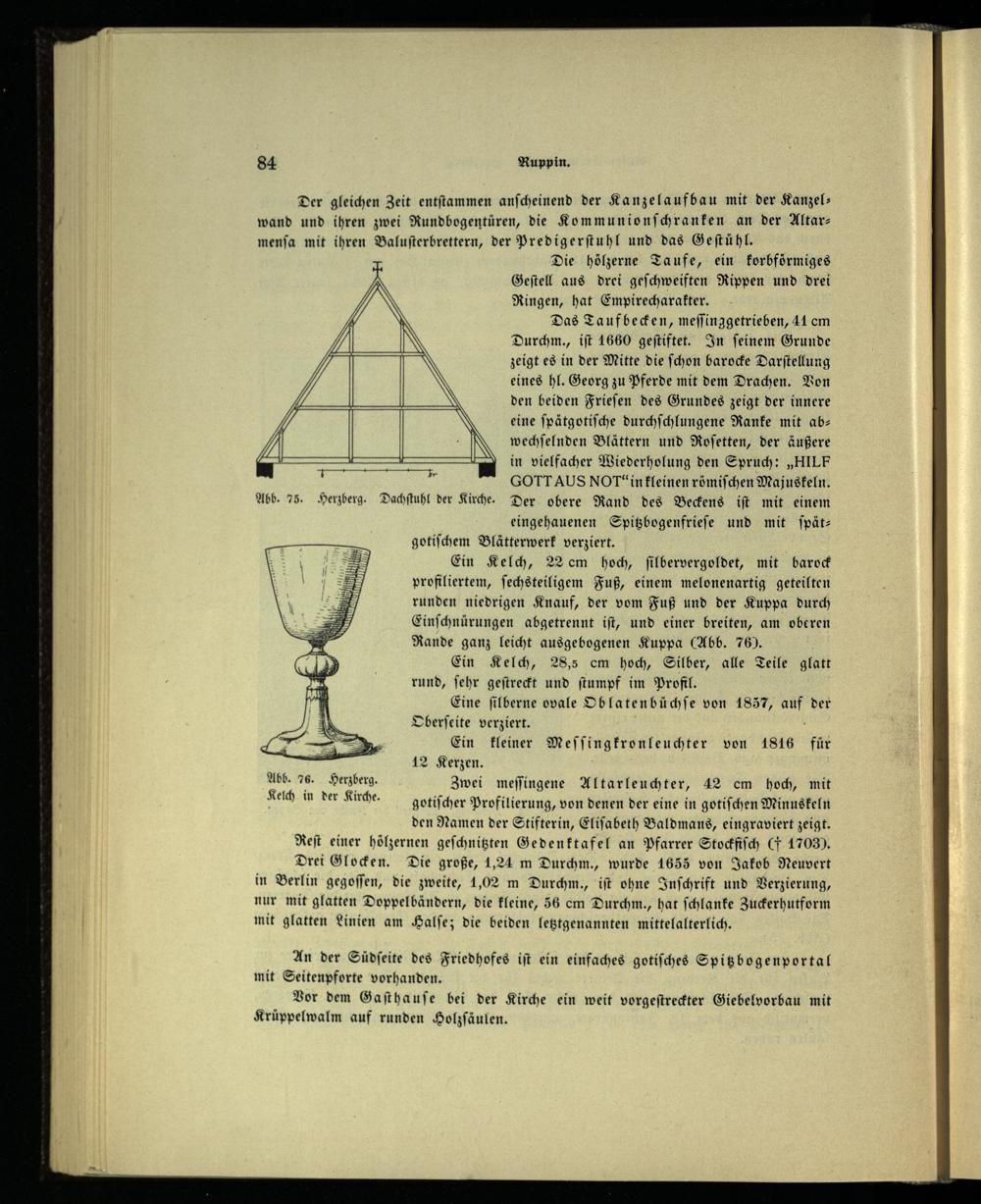 Das Taufbecken, meſſinggetrieben, 41 em Durchm., iſt 1660 geſtiftet. In ſeinem Grunde zeigt es in der Mitte die ſchon barocke Darſtellung eines hl. Georg zu Pferde mit dem Drachen. Von den beiden Frieſen des Grundes zeigt der innere eine ſpätgotiſche durchſchlungene Ranke mit abwechſelnden Blättern und Roſetten, der äußere in vielfacher Wiederholung den Spruch:„HILF GOTT AUS NOT“in kleinen römiſchen Majuskeln. Abb. 75. Herzberg. Dachſtuhl der Kirche. Der obere Rand des Beckens iſt mit einem