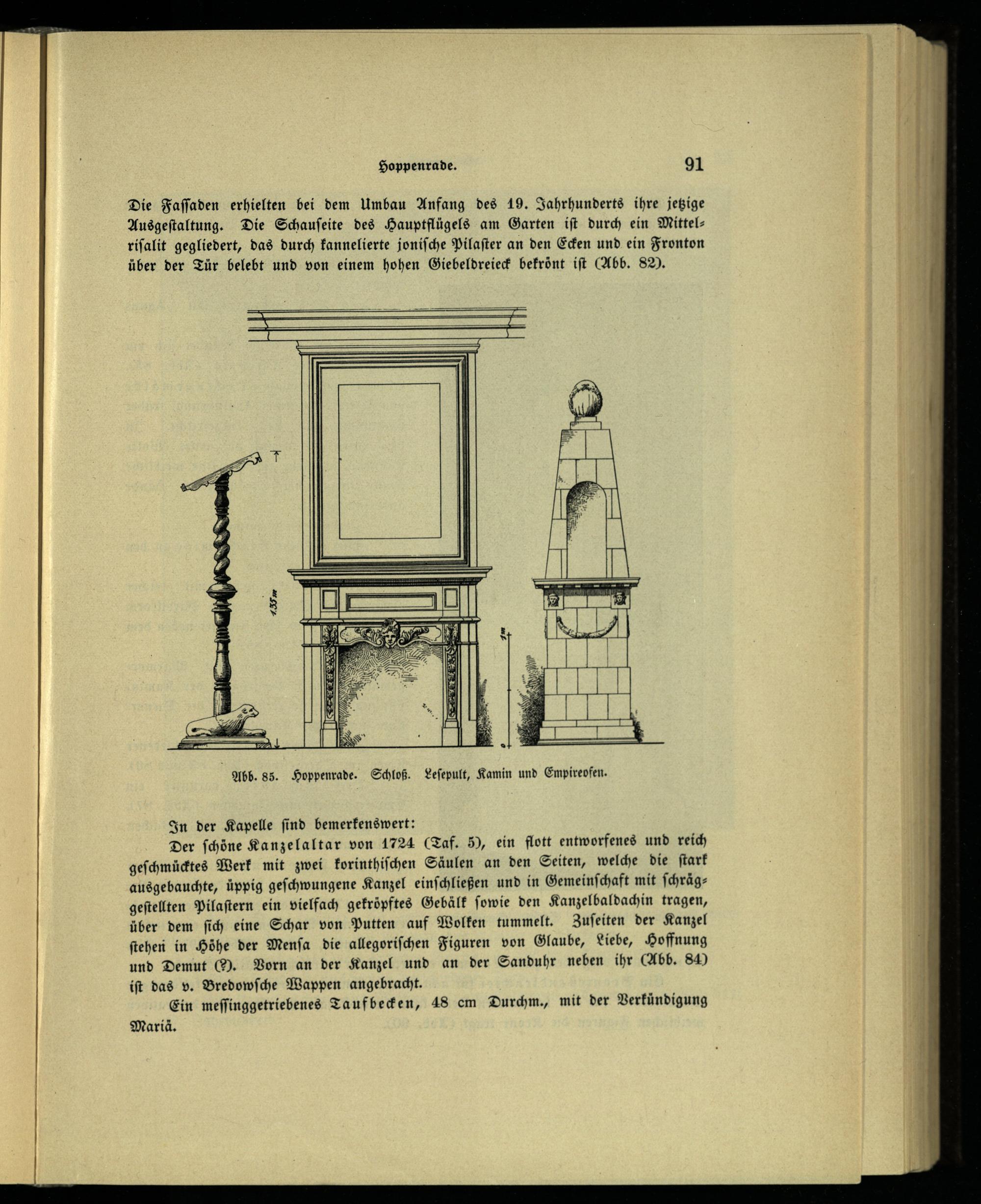 Abb. 85. Hoppenrade. Schloß. Leſepult, Kamin und Empireofen.