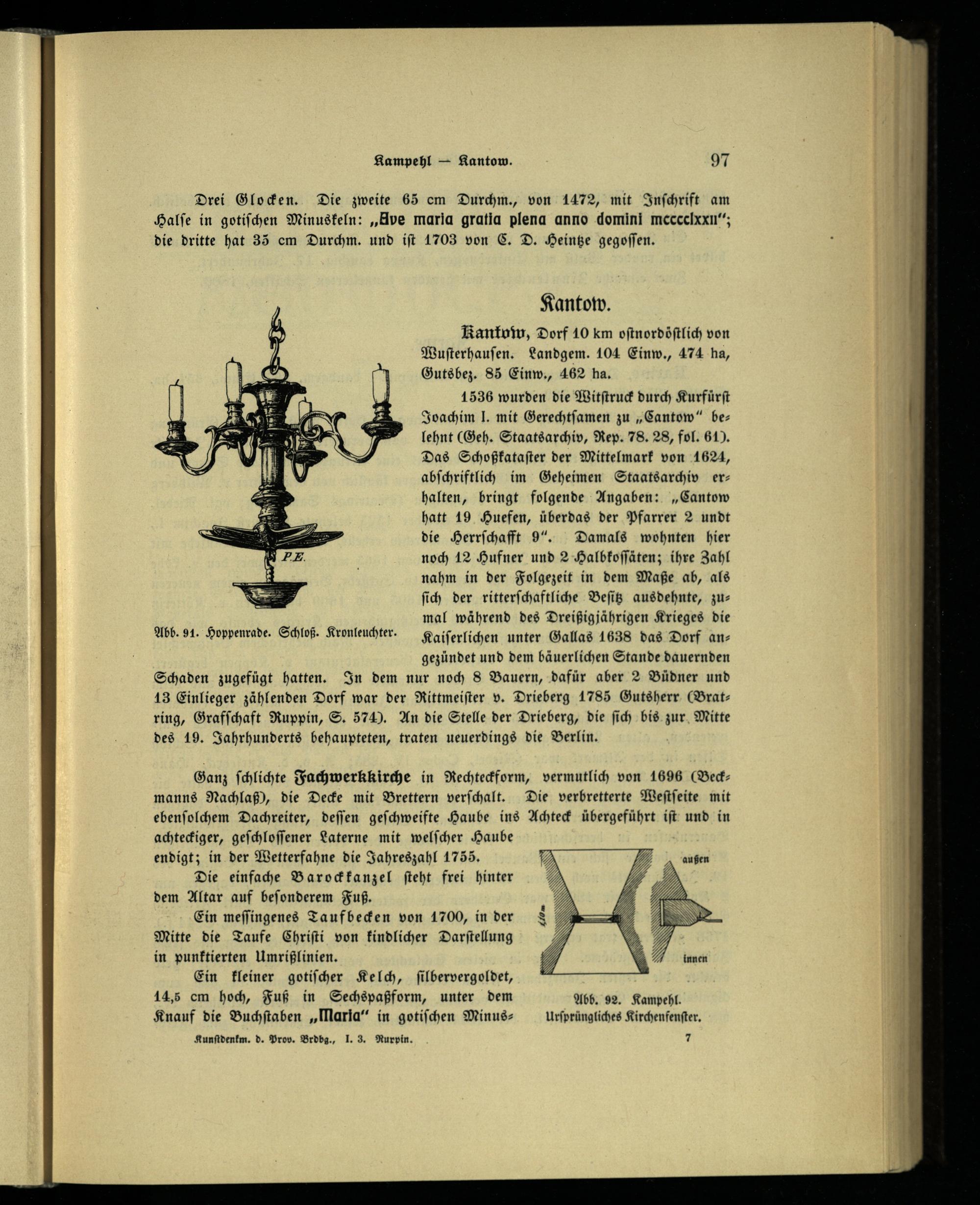 Rantum , Dorf 10 Rm oſtnordöſtlich von Wuſterhauſen . Landgem. 104 Einw., 474 ha, Gutsbez. S5 Einw., 462 ha. 1536 wurden die Witſtruck durch Kurfürſt Joachim J. mit Gerechtſamen zu„Cantow“ belehnt(Geh. Staatsarchiv, Rep. 78. 28, fol. 64). Das Schoßkataſter der Mittelmark von 1624, abſchriftlich im Geheimen Staatsarchiv erhalten, bringt folgende Angaben:„Cantow hatt 19 Huefen, überdas der Pfarrer 2 undt die Herrſchafft 9“. Damals wohnten hier noch 12 Hufner und 2 Halbkoſſäten; ihre Zahl nahm in der Folgezeit in dem Maße ab, als ſich der ritterſchaftliche Beſitz ausdehnte, zumal während des Dreißigjährigen Krieges die Abb. 91. Hoppenrade. Schloß. Kronleuchter. Kaiſerlichen unter Gallas 1638 das Dorf an— gezündet und dem bäuerlichen Stande dauernden Schaden zugefügt hatten. In dem nur noch 8 Bauern, dafür aber 2 Büdner und 13 Einlieger zählenden Dorf war der Rittmeiſter v. Drieberg 1785 Gutsherr(Bratring, Grafſchaft Ruppin , S. 574). An die Stelle der Drieberg, die ſich bis zur Mitte des 19. Jahrhunderts behaupteten, traten ueuerdings die Berlin .