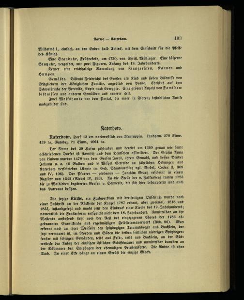 Der Name des 29 Hufen zählenden und bereits um 1360 genau wie heute geſchriebenen Dorfes iſt ſlawiſch und dem Deutſchen aſſimiliert. Der Gräfin Anna von Lindow wurden 1478 von dem Grafen Jacob, ihrem Gemahl, und deſſen Bruder Johann u. a. 10 Gulden und 8 Wiſpel Getreide an jährlichen Hebungen aus Katerbow verſchrieben(Kopie im Geh. Staatsarchiv; vgl. Riedel, Codex Il, 309 und IV, 106). Der Pfarrer— plebanus— Joachim Graetz erſcheint in einem Regiſter von 1542(Riedel IV, 193). An die Stelle der v. Falkenberg traten 1723 die zu Walsleben begüterten Grafen v. Schwerin , die ſich hier behaupteten und auch das Patronat beſitzen.