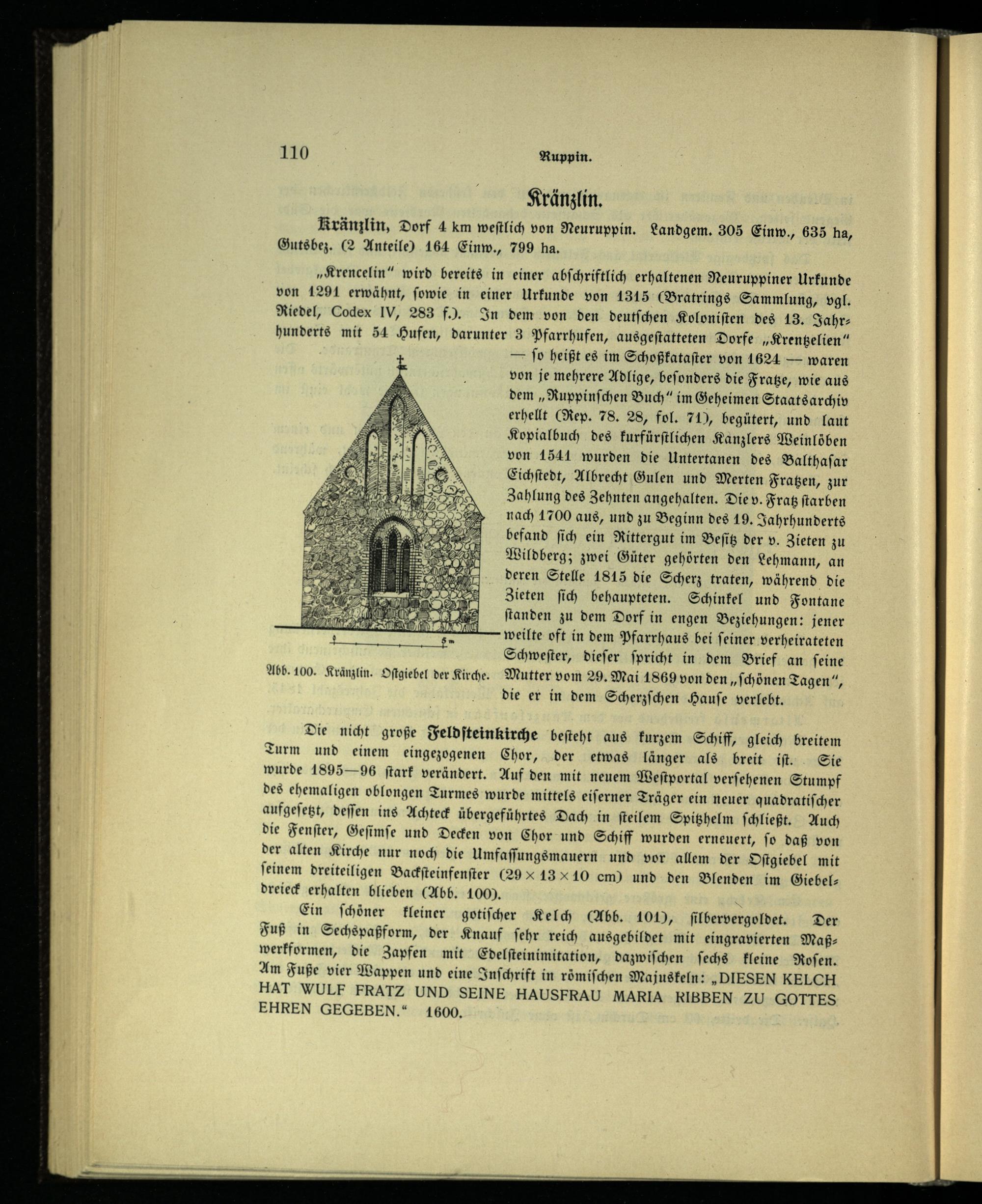 „Krencelin“ wird bereits in einer abſchriftlich erhaltenen Neuruppiner Urkunde von 1291 erwähnt, ſowie in einer Urkunde von 1315(Bratrings Sammlung, vgl. Riedel, Codex IV , 283 f.). In dem von den deutſchen Koloniſten des 13. Jahr— hunderts mit 54 Hufen, darunter 3 Pfarrhufen, ausgeſtatteten Dorfe„Krentzelien“ — ſo heißt es im Schoßkataſter von 1624— waren von je mehrere Adlige, beſonders die Fratze, wie aus dem„Ruppinſchen Buch“ im Geheimen Staats archiv erhellt(Rep. 78. 28, fol. 71), begütert, und laut Kopialbuch des kurfürſtlichen Kanzlers Weinlöben von 1541 wurden die Untertanen des Balthaſar Eichſtedt, Albrecht Gulen und Merten Fratzen, zur Zahlung des Zehnten angehalten. Die v. Fratz ſtarben nach 1700 aus, und zu Beginn des 19. Jahrhunderts befand ſich ein Rittergut im Beſitz der v. Zieten zu Wildberg ; zwei Güter gehörten den Lehmann, an deren Stelle 1815 die Scherz traten, während die Zieten ſich behaupteten. Schinkel und Fontane ſtanden zu dem Dorf in engen Beziehungen: jener weilte oft in dem Pfarrhaus bei ſeiner verheirateten Schweſter, dieſer ſpricht in dem Brief an ſeine