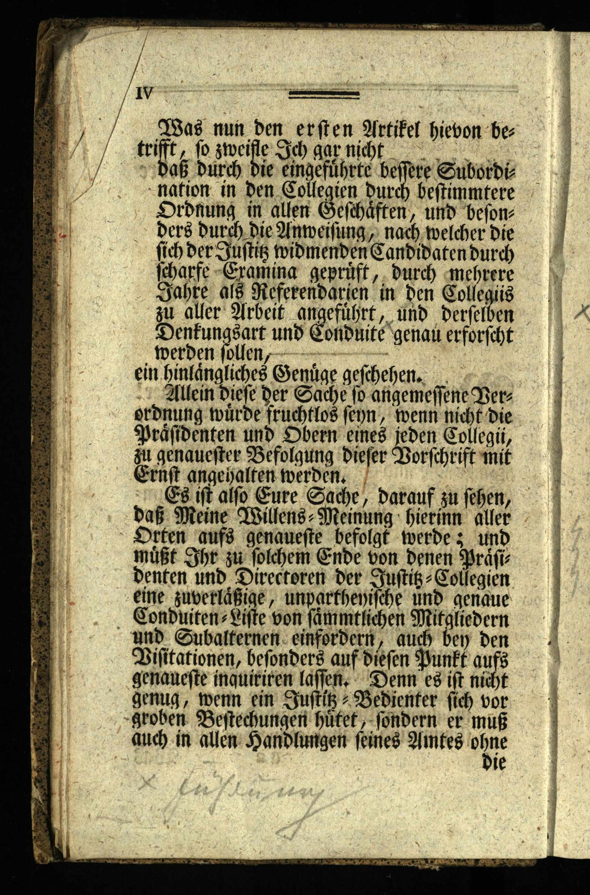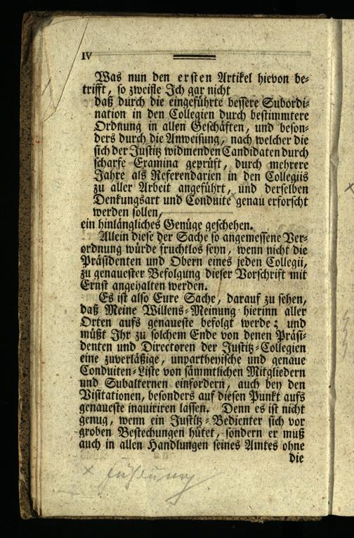 Es ist also Eure Sache, darauf zu sehen, daß Meine Willens Meinung hierinn aller Orten aufs genaueste befolgt werde; und müßt Ihr zu solchem Ende von denen Präsi denten und Directoren der Justiz- Collegien eine zuverläßige, unparthenische und genaue Conduiten Liste von sämmtlichen Mitgliedern und Subalternen einfordern, auch bey den Visitationen, besonders auf diesen Punkt aufs genaueste inquiriren lassen. Denn es ist nicht genug, wenn ein Justiz Bedienter sich vor groben Bestechungen hütet, sondern er muß auch in allen Handlungen seines Amtes ohne