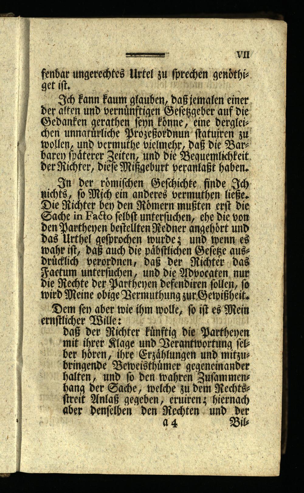 In der römischen Geschichte finde Ich nichts, so Mich ein anderes vermuthen ließe. Die Richter ben den Römern mußten erst die Sache in Facto selbst untersuchen, ehe die von den Partheyen bestellten Redner angehört und das Urthel gesprochen wurde; und wenn es wahr ist, daß auch die påbstlichen Gefeße auss drücklich verordnen, daß der Richter das Factum untersuchen, und die Advocaten nur Die Rechte der Partheyen defendiren sollen, so wird Meine obige Vermuthung zur Gewißheit. Dem fen aber wie ihm wolle, so ist es Mein ernstlicher Wille: