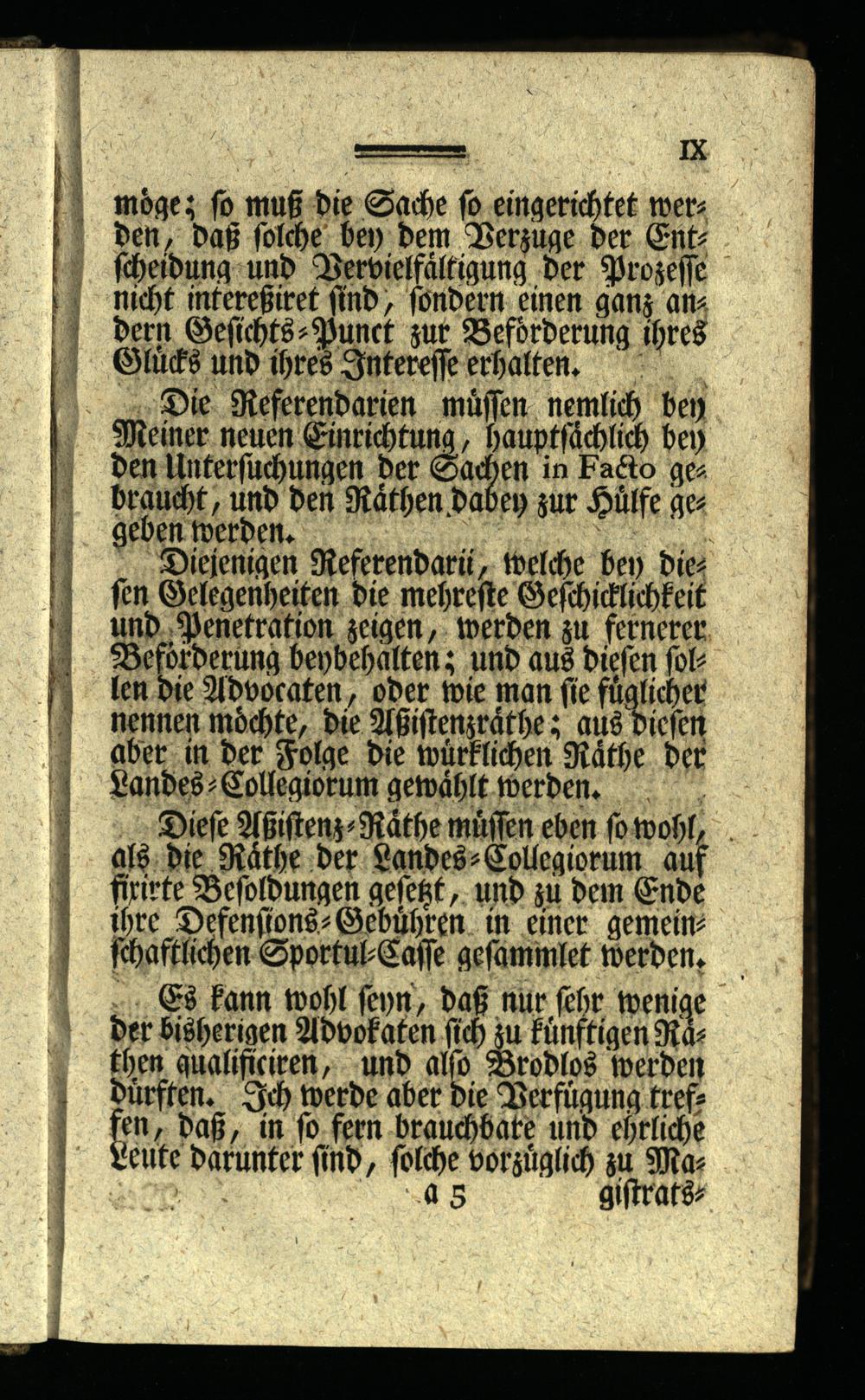Diejenigen Referendarii, welche ben diesen Gelegenheiten die mehreste Geschicklichkeit und Penetration zeigen, werden zu fernerer Beförderung benbehalten; und aus diesen sollen die Advocaten, oder wie man sie füglicher nennen möchte, die Aßistenzråthe; aus diesen aber in der Folge die wirklichen Räthe der Landes Collegiorum gewählt werden.