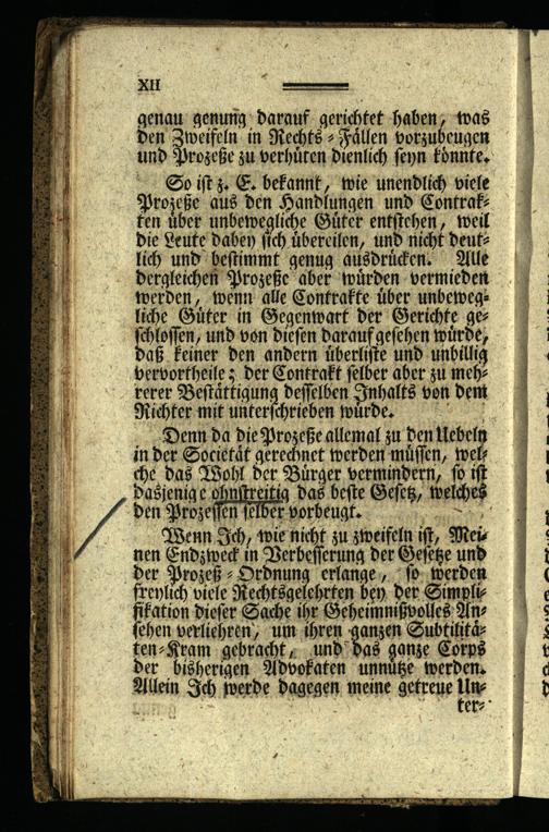 Wenn Jch, wie nicht zu zweifeln ist, Mei nen Endzweck in Verbesserung der Gesetze und der Prozeß Ordnung erlange, so werden freylich viele Rechtsgelehrten bey der Simpli fikation dieser Sache ihr Geheimnißvolles Anfehen verliehren, um ihren ganzen Subtilita ten- Kram gebracht, und das ganze Corps der bisherigen Advokaten unnüze werden. Allein Ich werde dagegen meine getreue un