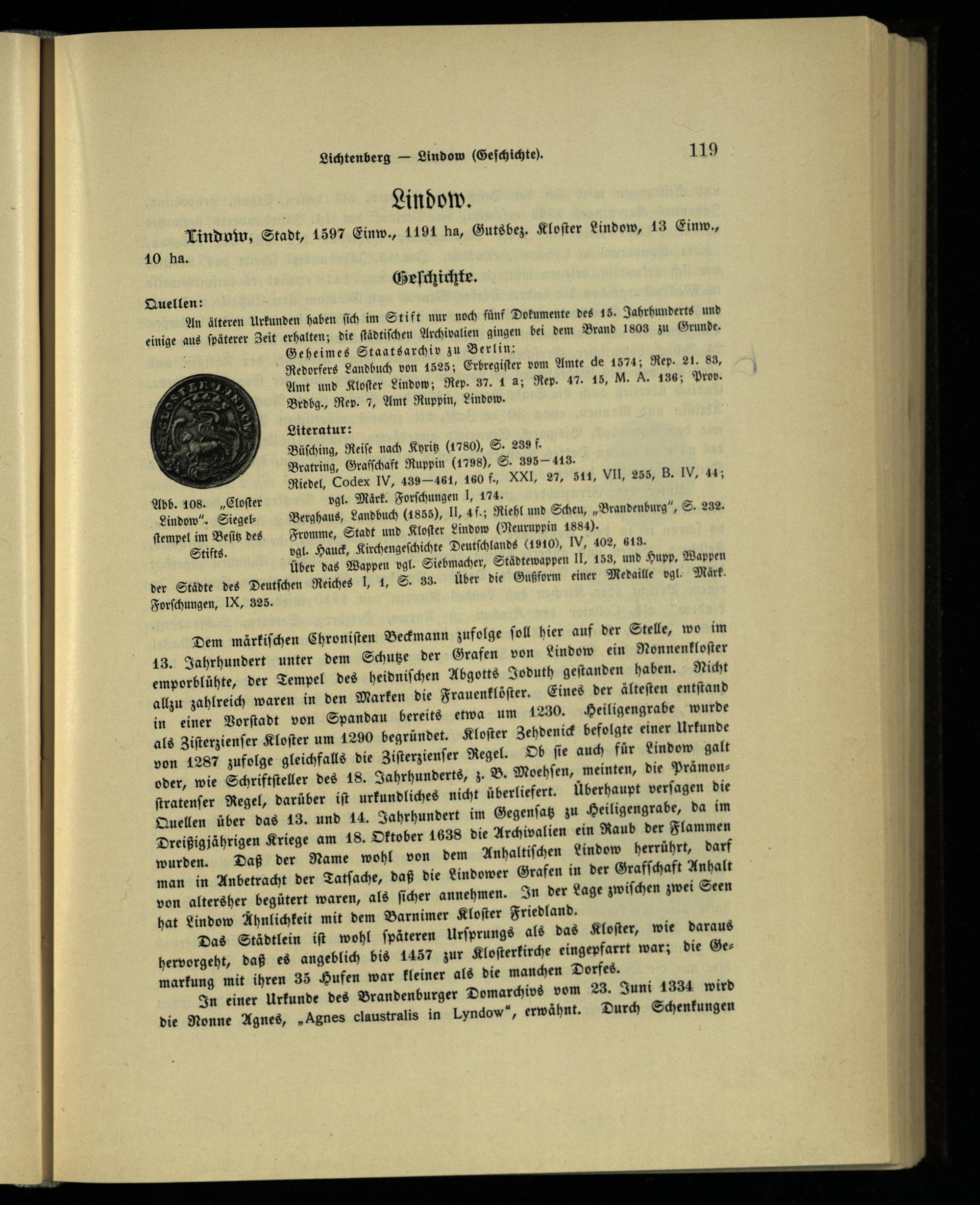 An älteren Urkunden haben ſich im Stift nur noch fünf Dokumente des 15. Jahrhunderts und einige aus ſpäterer Zeit erhalten; die ſtädtiſchen Archivalien gingen bei dem Brand 1803 zu Grunde. . Geheimes Staatsarchiv zu Berlin : Redorfers Landbuch von 1525, Erbregiſter vom Amte de 1574; Rep. 21. 88, Amt und Kloſter Lindow ; Rep. 37. 1 a; Rep. 147. 15, M. A. 136; Prov. Brdbg., Rey. 7, Amt Ruppin , Lindow .