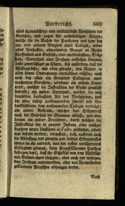 alles eigenmächtige und willkührliche Verfahren der Gerichte, und gegen die nachtheiligen Folgen, welche für die Rechte der Partheyen aus dem bey ein oder anderm Mitglied eines Collegii, wider alles Verhoffen, obwaltenden Mangel an Recht fchaffenheit und Einsicht, oder ausLeichtsinn, Trågs heit, Vorurtheil oder Irrthum entstehen könnten, Defto zuverläßiger zu sichern, soll aufferdem, daß die Aßistenzräthe, wie oben gedacht, den Richter in allen seinen Operationen controlliren müssen, auch noch bey allen ein formirtes Collegium auss machenden Gerichten, jedesmal ein andrer Depus tirter, welcher die Instruktion der Sache zunächst betreibt; ein andrer Decernent, welcher die von demselben beobachtete Art des Verfahrens, und die etwa dabey vorkommenden Zweifel und Bes denklichkeiten dem versammelten Collegio vortragt; ein andrer Referent, welcher das Erkenntniß nach der Mehrheit der Stimmen abfaßt; und wie. Derum ein andrer Deputirter, durch welchen die Instruktion der in zweyter Instanz etwa nachges brachten neuen Umstände in Facto geschiehet, jedes mal bestellt werden; dergestalt, daß, nachdem auch Die Abfaffung des zweyten und dritten Erkenntnisses immer an ein anderes, von den ersten verschiedenes Collegium gelangt, keine Prozeßführende Parthey besorgen darf, daß ihr Schicksal von dem Willkühr und Befund eines einzigen, oder auch nur weniger, dem Irrthum unterworfner, oder von Vorurtheilen geblendeter Menschen abhangen werde.
