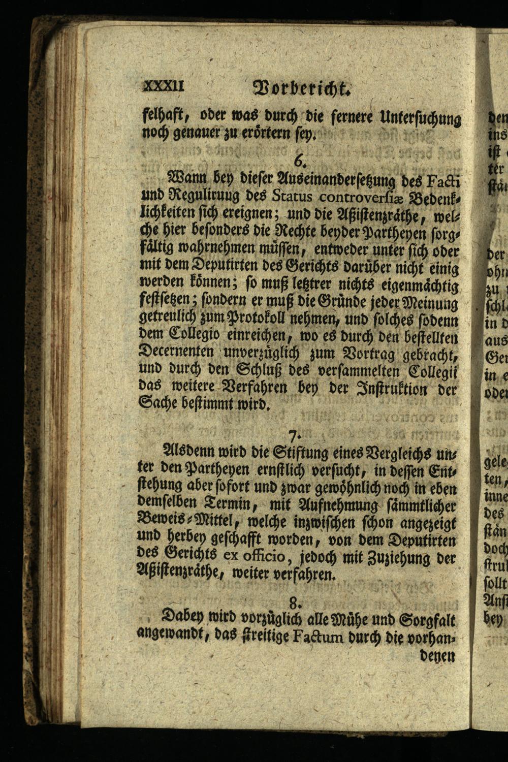 Wann bey dieser Auseinandersehung des Facti und Reguliruug des Status controverfia Bedenk lichkeiten sich ereignen; und die Aßistenzráthe, wel che hier besonders die Rechte beyder Partheyen sorgs fältig wahrnehmen müssen, entweder unter sich oder mit dem Deputirten des Gerichts darüber nicht einig werden können; so muß lettrer nichts eigenmächtig festsetzen; sondern er muß die Gründe jeder Meinung getreulich zum Protokoll nehmen, und solches sodenn dem Collegio einreichen, wo es durch den bestellten Decernenten unverzüglich zum Vortrag gebracht, und durch den Schluß des versammelten Collegii das weitere Verfahren bey der Instruktion der Sache bestimmt wird.