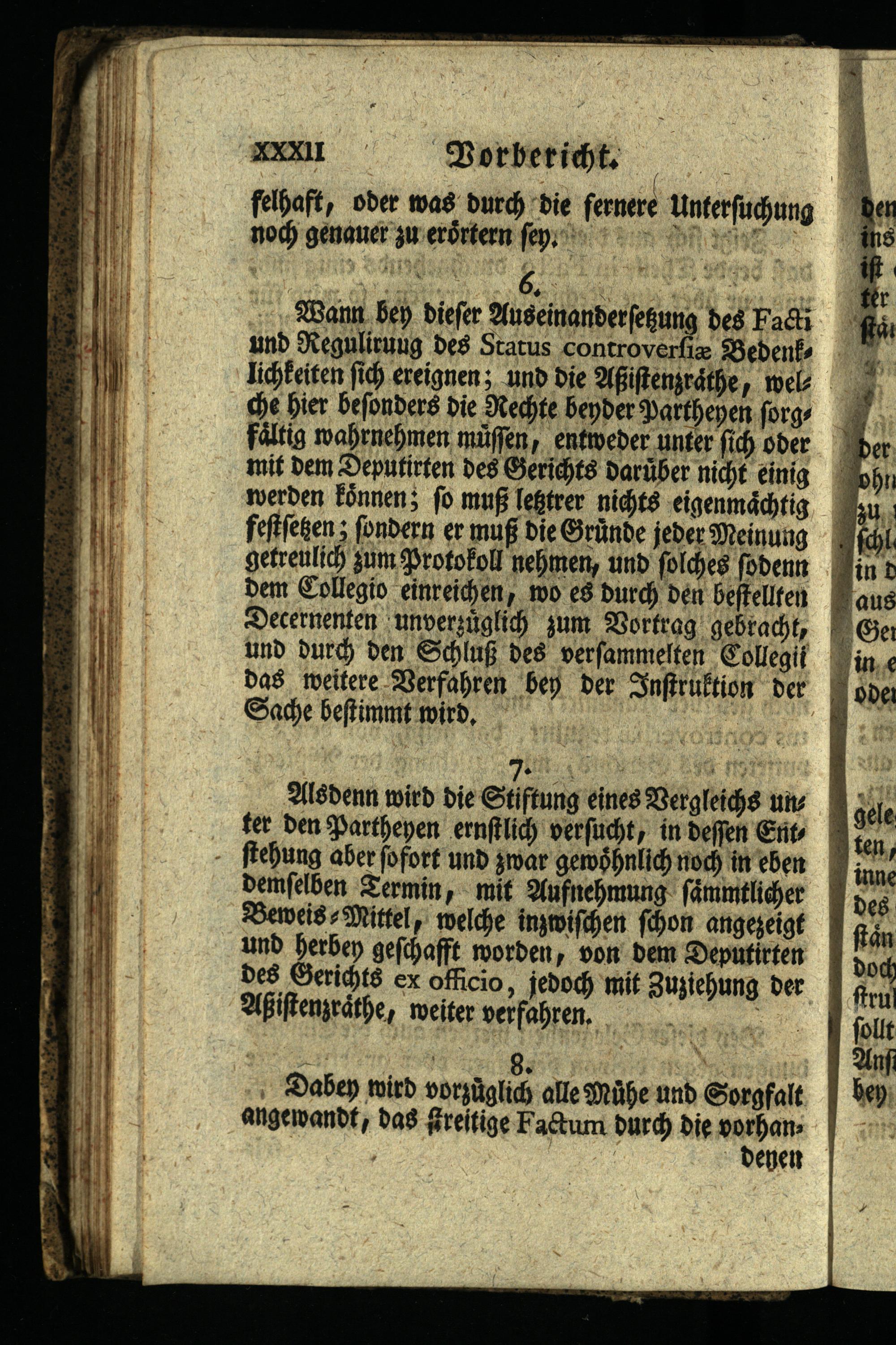 Alsdenn wird die Stiftung eines Vergleichs uns ter den Partheyen ernstlich versucht, in dessen Ent stehung aber sofort und zwar gewöhnlich noch in eben demselben Termin, mit Aufnehmung sämmtlicher Beweis Mittel, welche inzwischen schon angezeigt und herben geschafft worden, von dem Deputirten des Gerichts ex officio, jedoch mit 3uziehung der Aßistenzräthe, weiter verfahren.