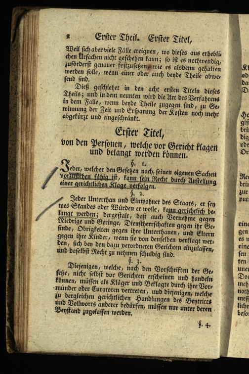 Jeder Unterthan und Einwohner des Staats, er sey wes Standes oder Würden er wolle, kann gerichtlich bes langt werden; dergestalt, daß auch Vornehme gegen Niedrige und Geringe, Dienstherrschaften gegen ihr Ges finde, Obrigkeiten gegen ihre Unterthanen, und Eltern gegen ihre Kinder, wenn sie von denselben verklagt wer den, sich bey den dazu verordneten Gerichten einzulassen, und daselbst Recht zu nehmen schuldig sind.