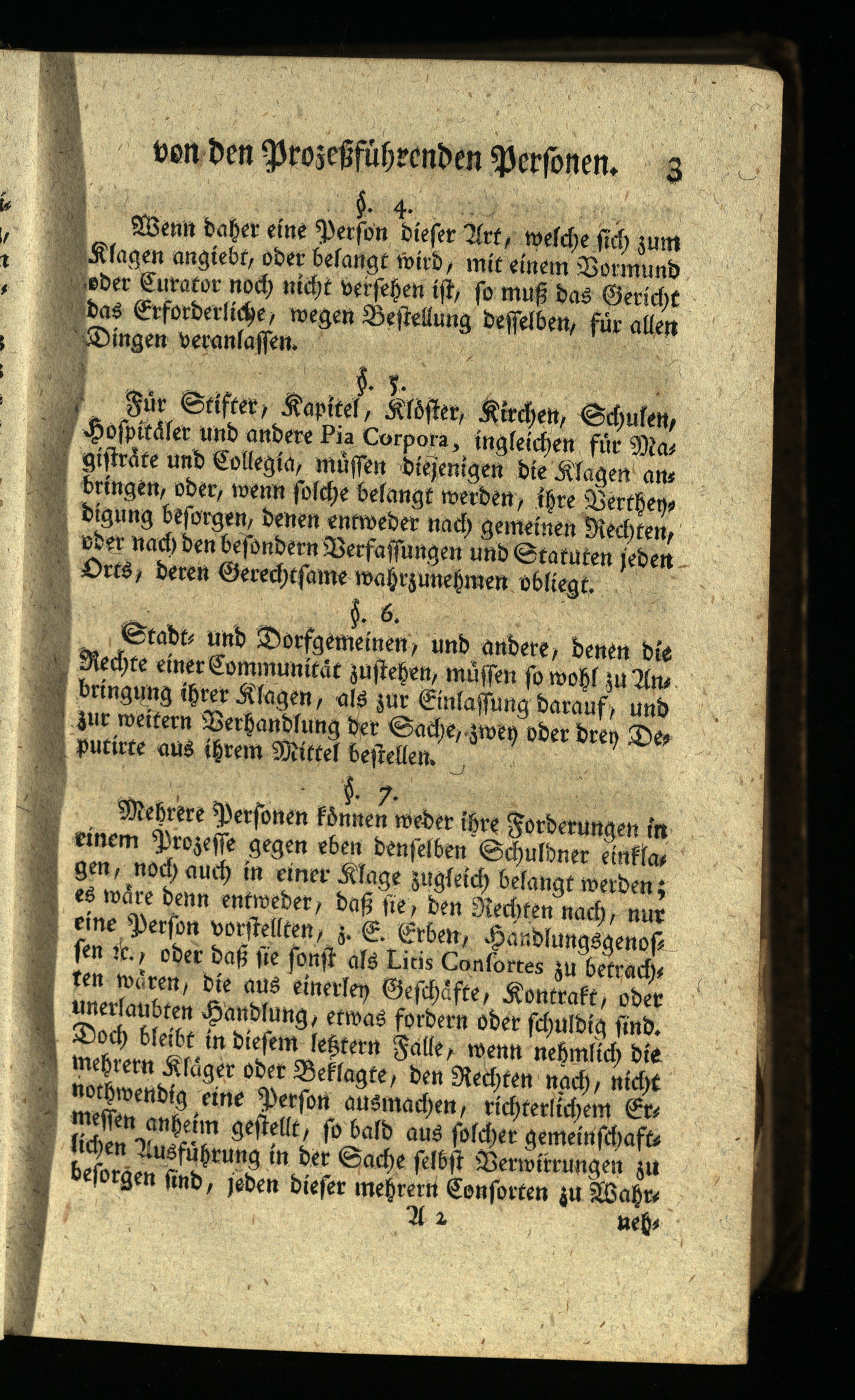 Für Stifter, Kapitel, Klöster, Kirchen, Schulen, Hospitaler und andere Pia Corpora, ingleichen für Mas gisträte und Collegia, müssen diejenigen die Klagen ans bringen, oder, wenn solche belangt werden, ihre Verthen, digung besorgen, denen entweder nach gemeinen Rechten, oder nach den besondern Verfassungen und Statuten jeden Orts, deren Gerechtsame wahrzunehmen obliegt.