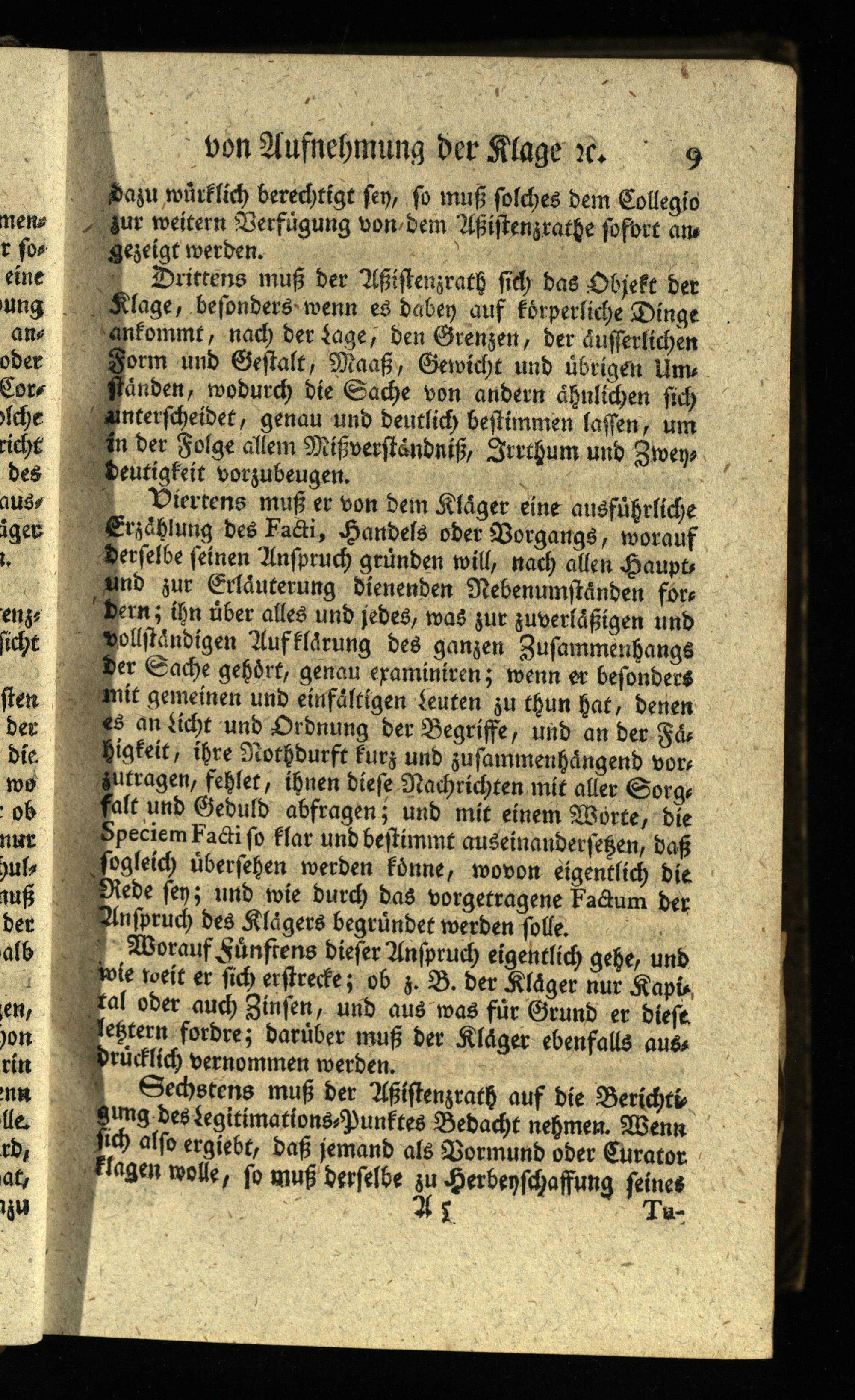 Drittens muß der Aßistenzrath sich das Objekt der Klage, besonders wenn es daben auf körperliche Dinge ankommt, nach der Lage, den Grenzen, der dufferlichen Form und Gestalt, Maaß, Gewicht und übrigen Um stånden, wodurch die Sache von andern ähnlichen sich anterscheidet, genau und deutlich bestimmen lassen, um in der Folge allem Mißverständniß, Irrthum und Zwey deutigkeit vorzubeugen.