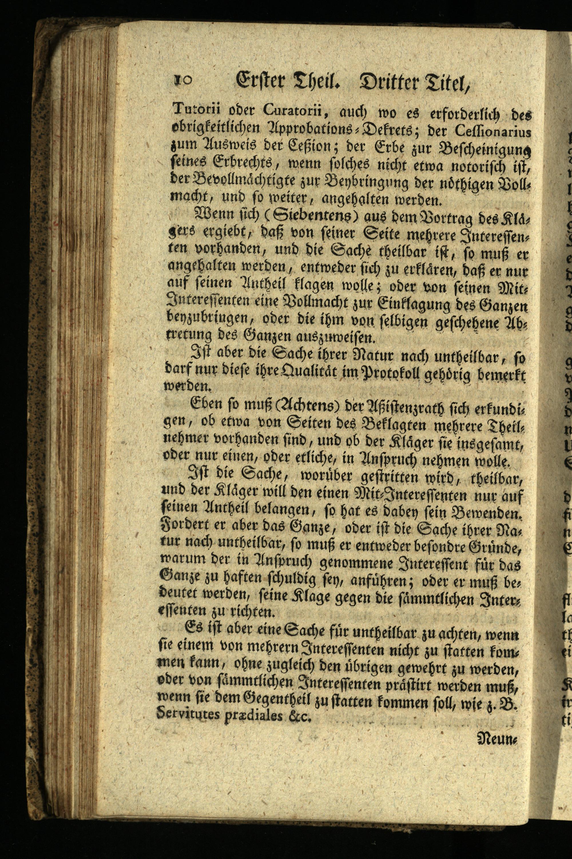 Wenn sich( Siebentens) aus dem Vortrag des Klas gers ergiebt, daß von seiner Seite mehrere Interessenten vorhanden, und die Sache theilbar ist, so muß er angehalten werden, entweder sich zu erklären, daß er nur auf seinen Antheil klagen wolle; oder von seinen Mita Interessenten eine Vollmacht zur Einklagung des Ganzen benzubringen, oder die ihm von selbigen geschehene Abs tretung des Ganzen auszuweisen.