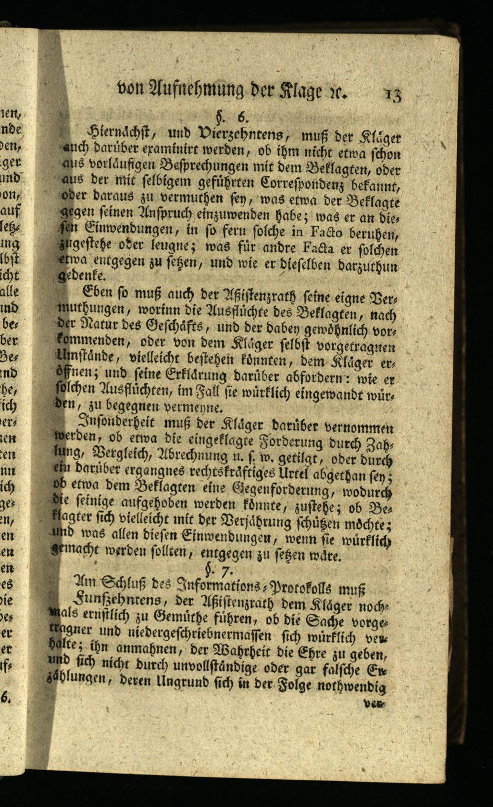 Um Schluß des Informations Protokolls muß Funfzehntens, der Aßistenzrath dem Kläger noch mals ernstlich zu Gemüthe führen, ob die Sache vorge tragner und niedergeschriebnermassen sich würklich ver halte; ihn anmahnen, der Wahrheit die Ehre zu geben, und sich nicht durch unvollständige oder gar falsche Eve zählungen, deren Ungrund sich in der Folge nothwendig
