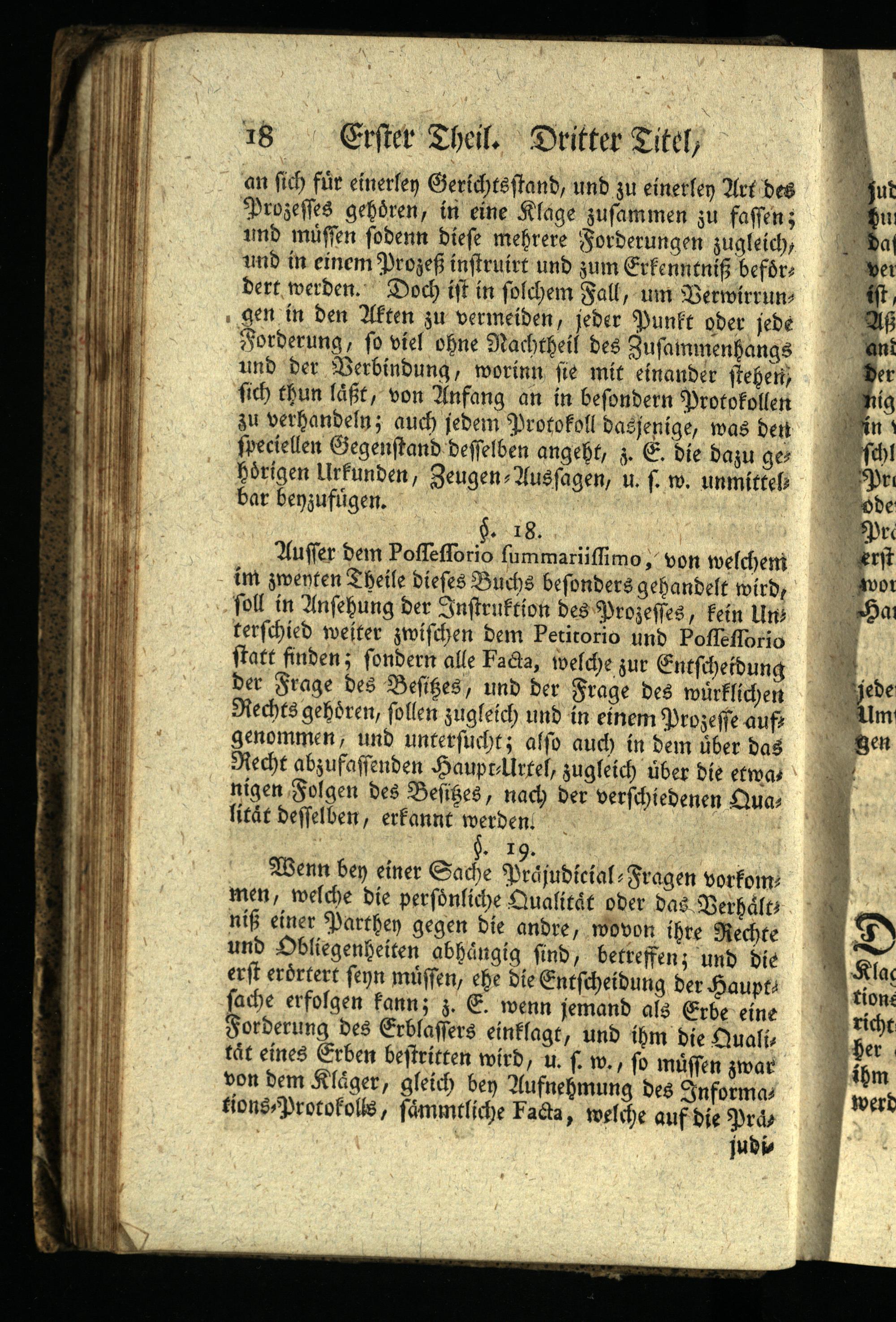 Auffer dem Poffefforio fummariiffimo, von welchemi im zwenten Theile dieses Buchs besonders gehandelt wird, foll in Ansehung der Instruktion des Prozesses, kein Uns terschied weiter zwischen dem Petitorio und Poffefforio statt finden; sondern alle Facta, welche zur Entscheidung der Frage des Besizes, und der Frage des wirklichen Rechts gehören, sollen zugleich und in einem Prozesse auf genommen, und untersucht; also auch in dem über das Recht abzufassenden Haupt- Urtel, zugleich über die etwas nigen Folgen des Besizes, nach der verschiedenen Qua lität desselben, erkannt werden.
