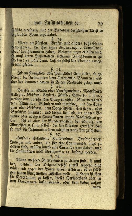 Befehle an Stadt oder Dorfgemeinen, Magistrate, Collegia, Stifter, Capitel, Zünfte, Gewerke, u. s. w., werden dem vorsißenden Burgermeister, Stadtverordnes ten, Altmeister, Schulzen und Gerichte, und bey Colle gien oder Stiftern, dem Borgeseßten, Vorsteher, oder Syndikus infinuirt; und diesen liegt ob, der ganzen Ges meine oder übrigen Interessenten davon Nachricht zu ges ben. Ist es aber der Burgermeister, der Schulz, der Altmeister u. s. w. selbst, der die Citation ertrahirt hat, so muß die Insinuation dem nächsten nach ihm geschehen. §. 27.
