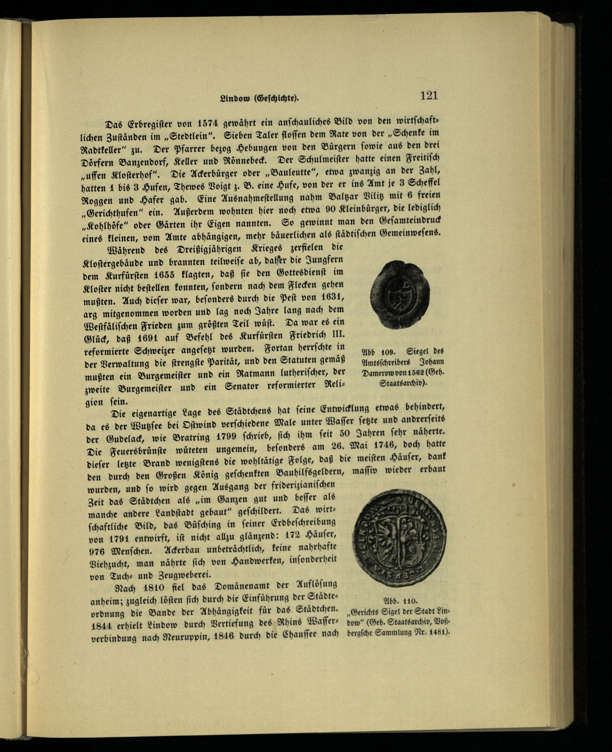 Nach 1810 fiel das Domänenamt der Auflöſung anheimz zugleich löſten ſich durch die Einführung der Städte⸗ it. 110. ordnung die Bande der Abhängigkeit für das Städtchen. Gerichts Sigel der Stadt Lin1844 erhielt Lindow durch Vertiefung des Rhins Waſſer⸗ dow“(Geh. Staatsarchiv, Voß: verbindung nach Neuruppin , 1816 durch die Chauſſee nach bergſche Sammlung Nr. 1489).