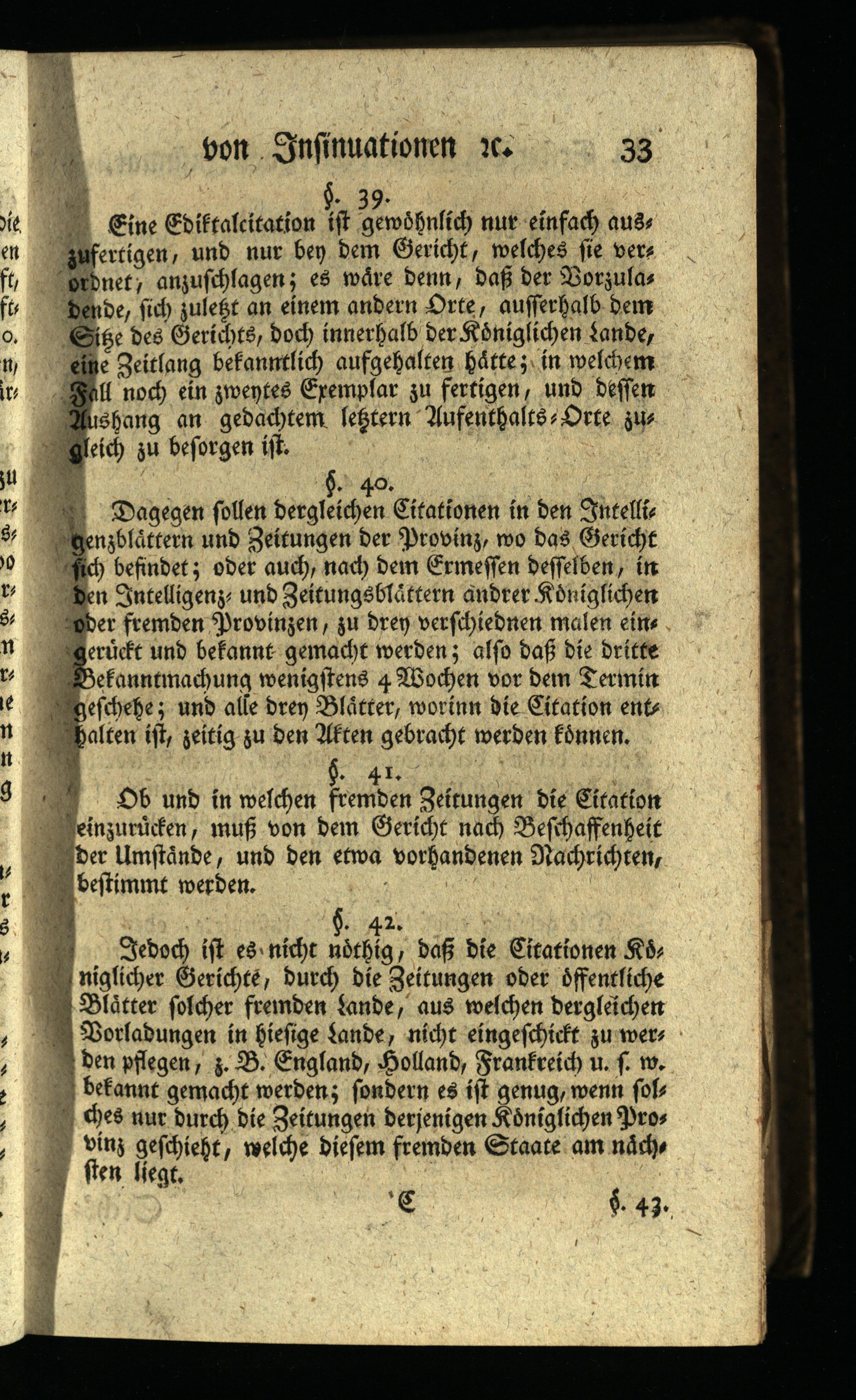 Jedoch ist es nicht nöthig, daß die Citationen Kdniglicher Gerichte, durch die Zeitungen oder öffentliche Blätter solcher fremden lande, aus welchen dergleichen Vorladungen in hiesige lande, nicht eingeschickt zu wer den pflegen, z. B. England, Holland, Frankreich u. f. w. bekannt gemacht werden; sondern es ist genug, wenn sols ches nur durch die Zeitungen derjenigen Königlichen Pros vinz geschieht, welche diesem fremden Staate am näch ften liegt.