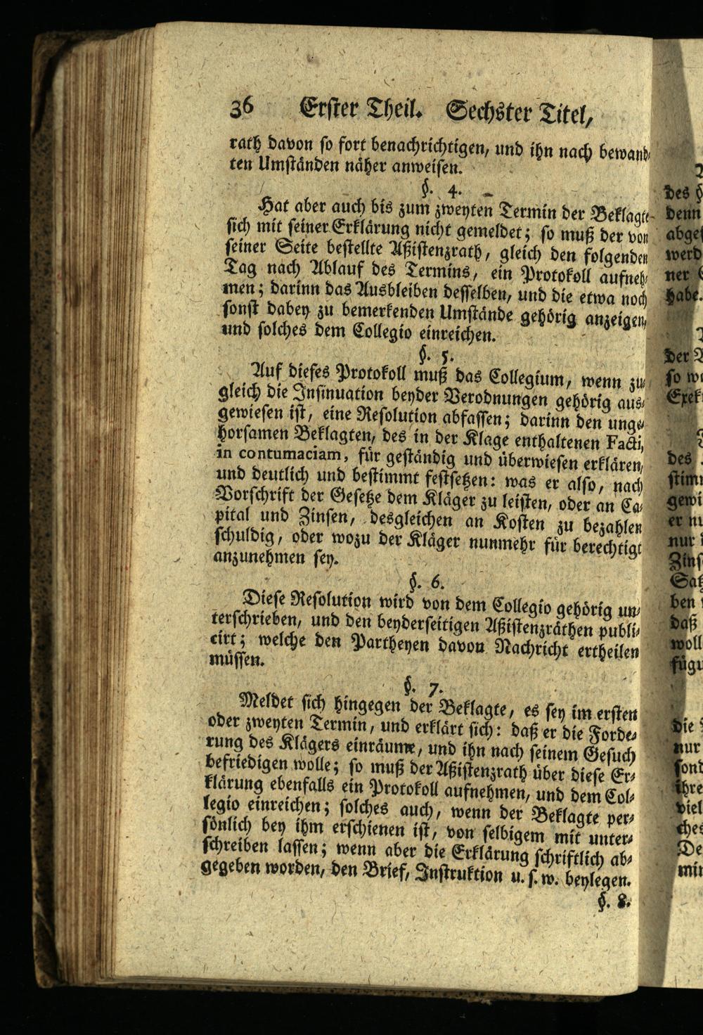 Auf diefes Protokoll muß das Collegium, wenn zu gleich die Insinuation bender Verodnungen gehörig aus gewiesen ist, eine Resolution abfassen; darinn den unge horsamen Beklagten, des in der Klage enthaltenen Facti, in contumaciam, für geständig und überwiesen erklären und deutlich und bestimmt festsetzen: was er also, nach ſtim Vorschrift der Gefeße dem Kläger zu leisten, oder an Ca pital und Zinsen, desgleichen an Kosten zu bezahlen schuldig, oder wozu der Kläger nunmehr für berechtigt anzunehmen sey.