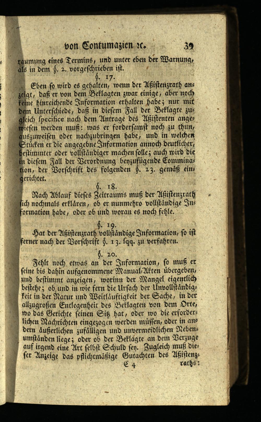 Eben so wird es gehalten, wenn der Aßistenzrath an zeigt, daß er von dem Beklagten zwar einige, aber noch keine hinreichende Information erhalten habe; nur mit dem Unterschiede, daß in diesem Fall der Beklagte zu gleich specifice nach dem Antrage des Aßistenten ange wiesen werden muß: was er fordersamst noch zu thun, auszuweisen oder nachzubringen habe, und in welchen Stücken er die angegebne Information annoch deutlicher, bestiminter oder vollständiger machen solle; auch wird die in diesem Fall der Verordnung beyzufügende Comminas tion, der Vorschrift des folgenden§. 23. gemäß ein gerichtet.